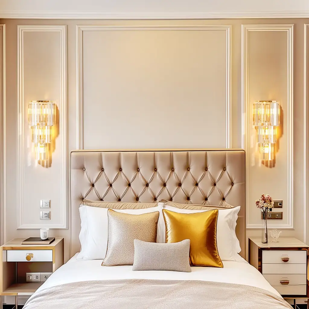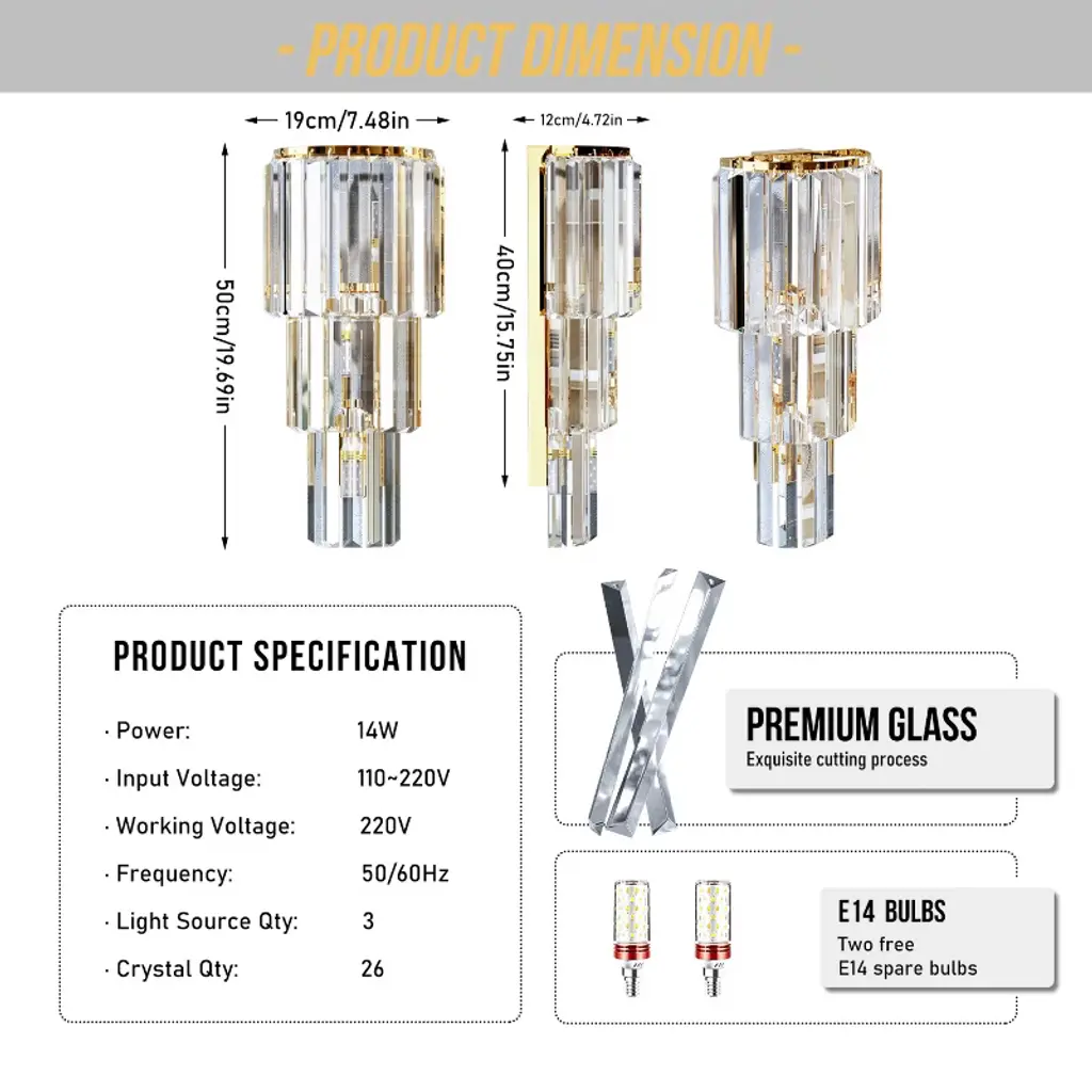 This luxury wall sconce features a layered structure with 3 tiers / 5 tiers, each adorned with meticulously arranged crystals for a stunning visual effect, refracting lights to fill the spaces. It accents the wall in a complimentary and elegant way, while E14 led corn lights provide illumination for ambient lighting that’s comfortable for relaxation. This wall sconce is a decorative lighting fixture that combines the elegance of crystal elements with the practicality of wall-mounted. The crystals, meticulously arranged to catch lights, creating a dazzling visual effect, while the led corn lights provide ambient lighting or warm glow for the spaces. Whether used it in pairs or placed individually, it brings both luxury and sophistication into your homes. This luxury wall sconce combines artistic design with functionality, it features a layered structure with 3 tier/ 5 tiers, each meticulously arranged with crystals that are carefully selected for their clarity and brilliance. Not only aesthetically pleasing but functional, it creates a visual effect by refracting light in various directions, filling the space with an enchanting glow. Package Included: 1 x Wall Crystal Sconce Lamp 1 x Instruction Guide 1 x Gloves (set) Note- 1. Feel free to contact after-sale services if the light doesn't work. 2. Please contact us for replacement if the crystals were lost or damaged in transit. - Please refer to the measurement. Tiny measuring error is allowable in normal range. - There might be a little color difference due to the monitor, camera or other factors, please refer to the physical item.