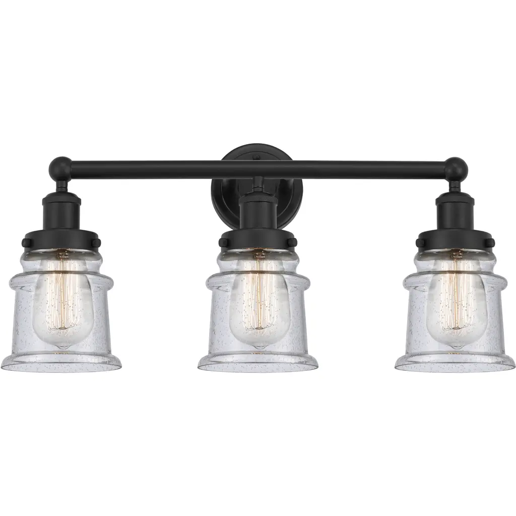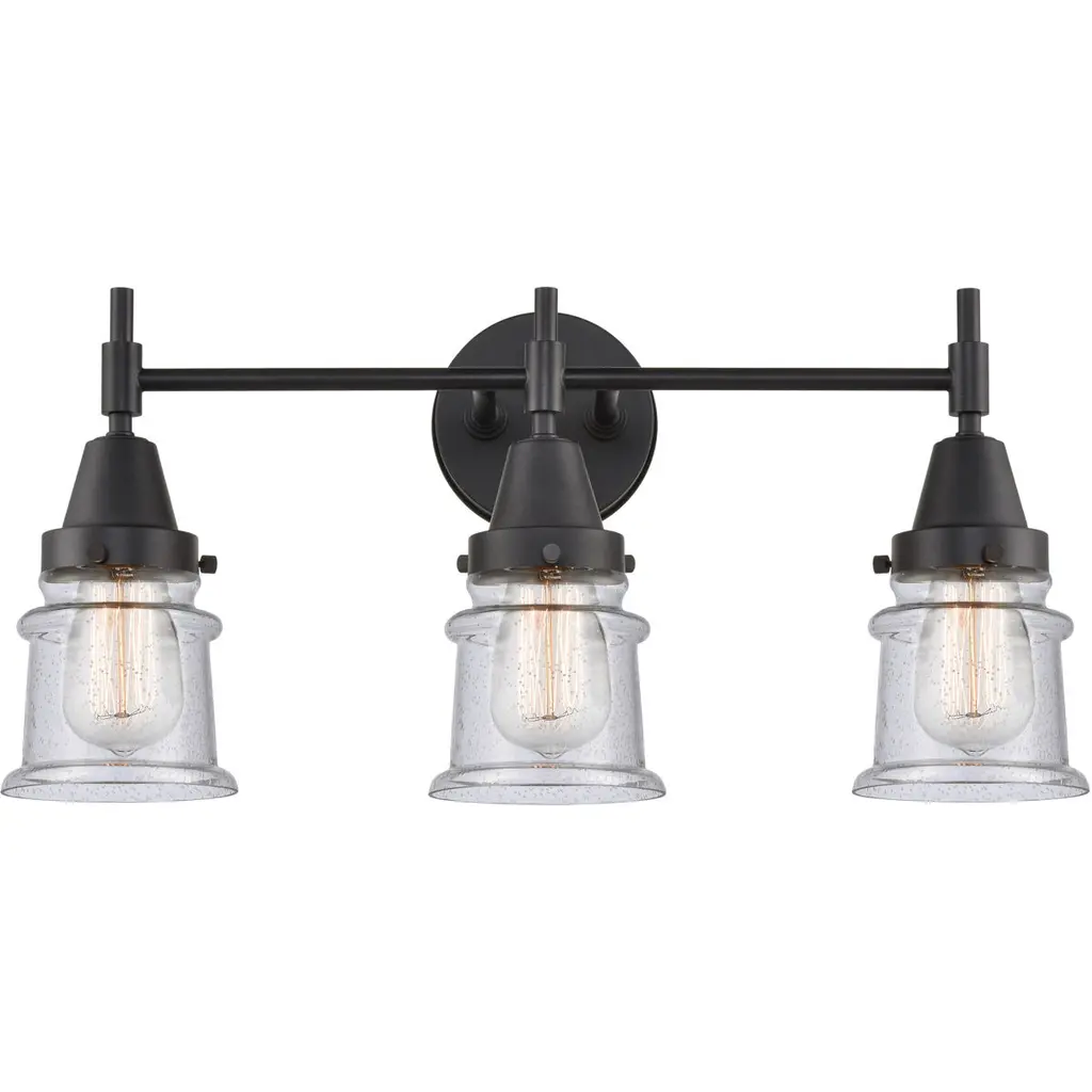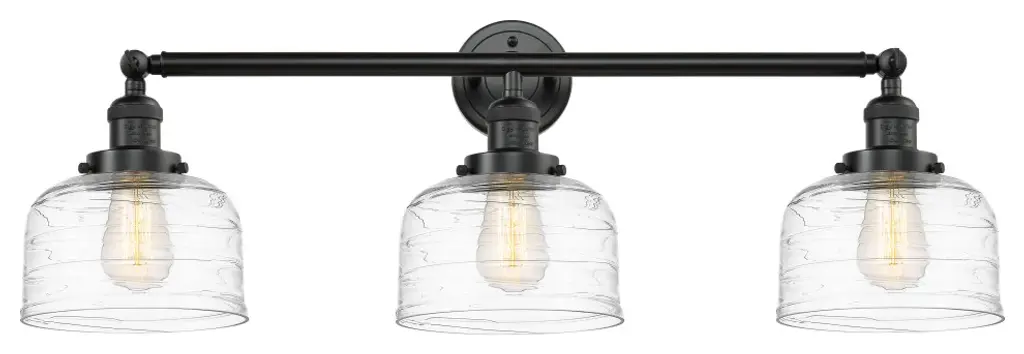 INNOVATIONS 616-3W-BK-G192 Bellmont 3 Light 24.5 inch Bath Vanity Light Matte Black. Style: Art Nouveau, Industrial, Restoration-Vintage, Transitional . Collection Name: Edison. Metal Finish(Body): Matte Black. Metal Finish(Canopy/Backplate): Matte Black. Material: Steel, Cast Brass, Glass. Dimension(in): 11.5(H) x 24.125(W) x 7.5625(Ext). Bulb: (3)60W Medium Base Incandescent(Not Included). Voltage: 120. Dimmable: Yes. Color Temperature (Kelvin): 2200. Color Rendering Index (CRI): 99.9. Lumens: 220. Life Expectancy (Hours): 2000. Glass Shade Description: Clear Bellmont. Glass Type: Transparent; Ribbed. Shade Shape: Bowl. Glass or Metal Shade Color: Clear. Shade Material: Glass. Shade Dimension(in): 6.125(W) x 6.25(H). Fitter Measurement (Glass Or Metal Shade Fitter Size): 3.25 inch Fitter. Backplate Dimension(in): 4.5(W) x 0.75(Depth). ADA Compliant: No. California Proposition 65 Warning Required: Yes. UL/ETL Certification Type: Damp Location.