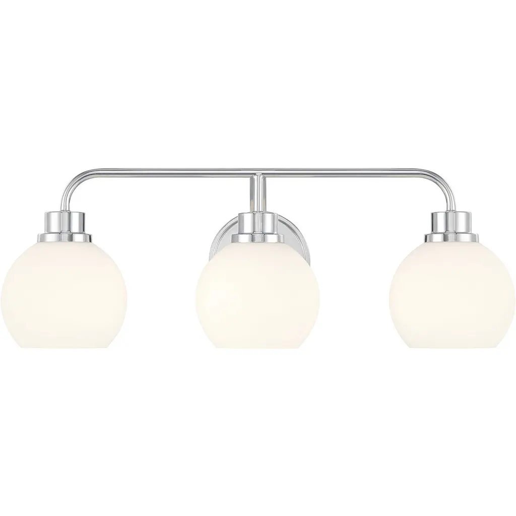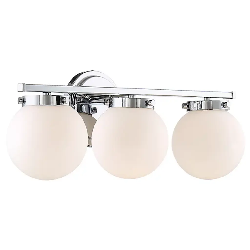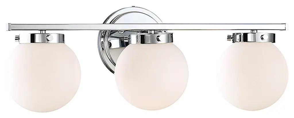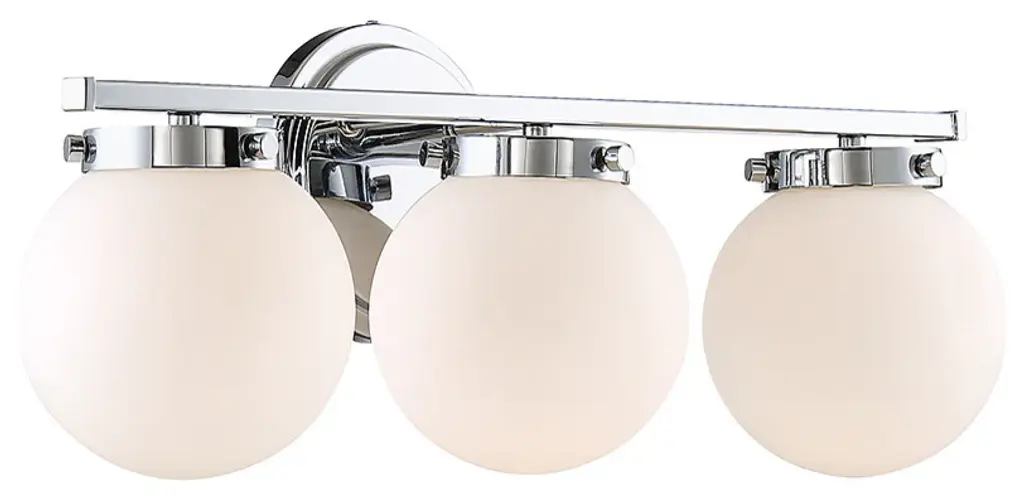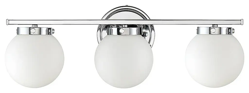 Illuminate your bathroom in chic, vintage-inspired style with this three-light vanity fixture. Orb-shaped shades of white opal glass mean you will get bright and comfortable light. The circular backplate echoes the shape of the shades, too. Voltage: 120Number of bulbs: 3Type of bulb: EWattage per bulb: 60Bulb included: NoUL damp locationFinish: ChromeMaterials: Metal and glassBackplate dimensions: W 6.05" x H 0.94"Dimensions: W 24" x H 8"