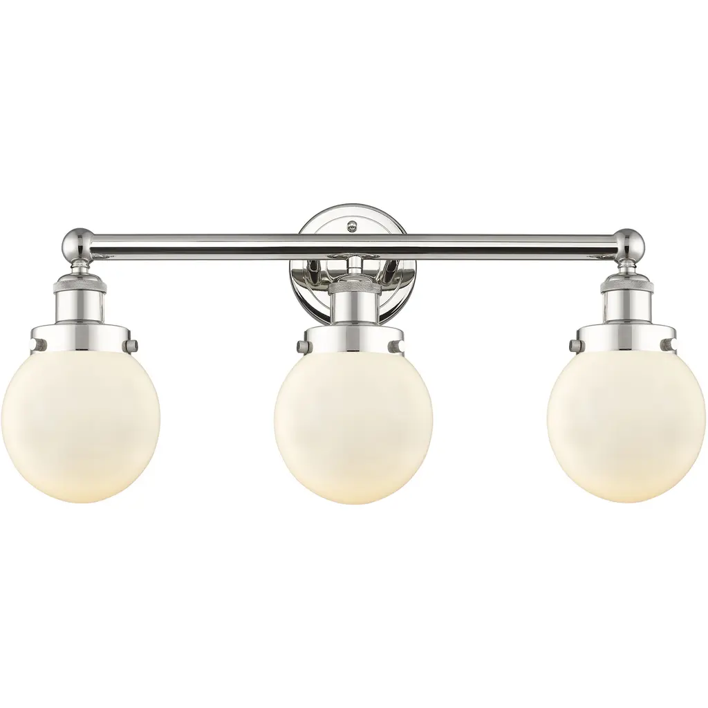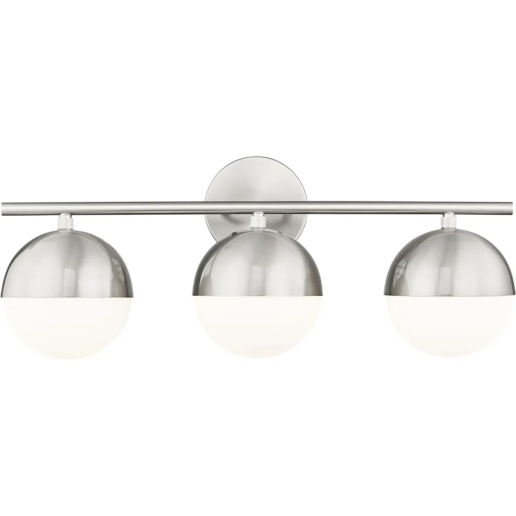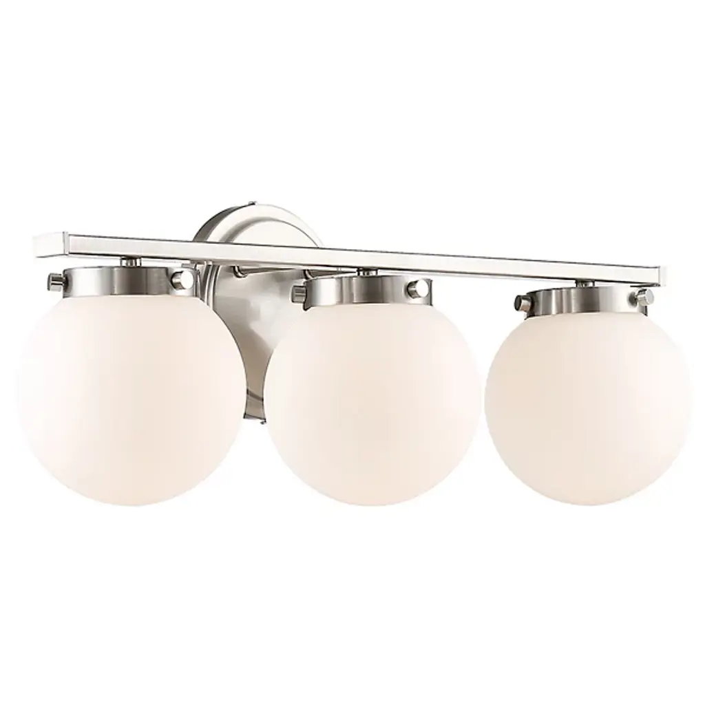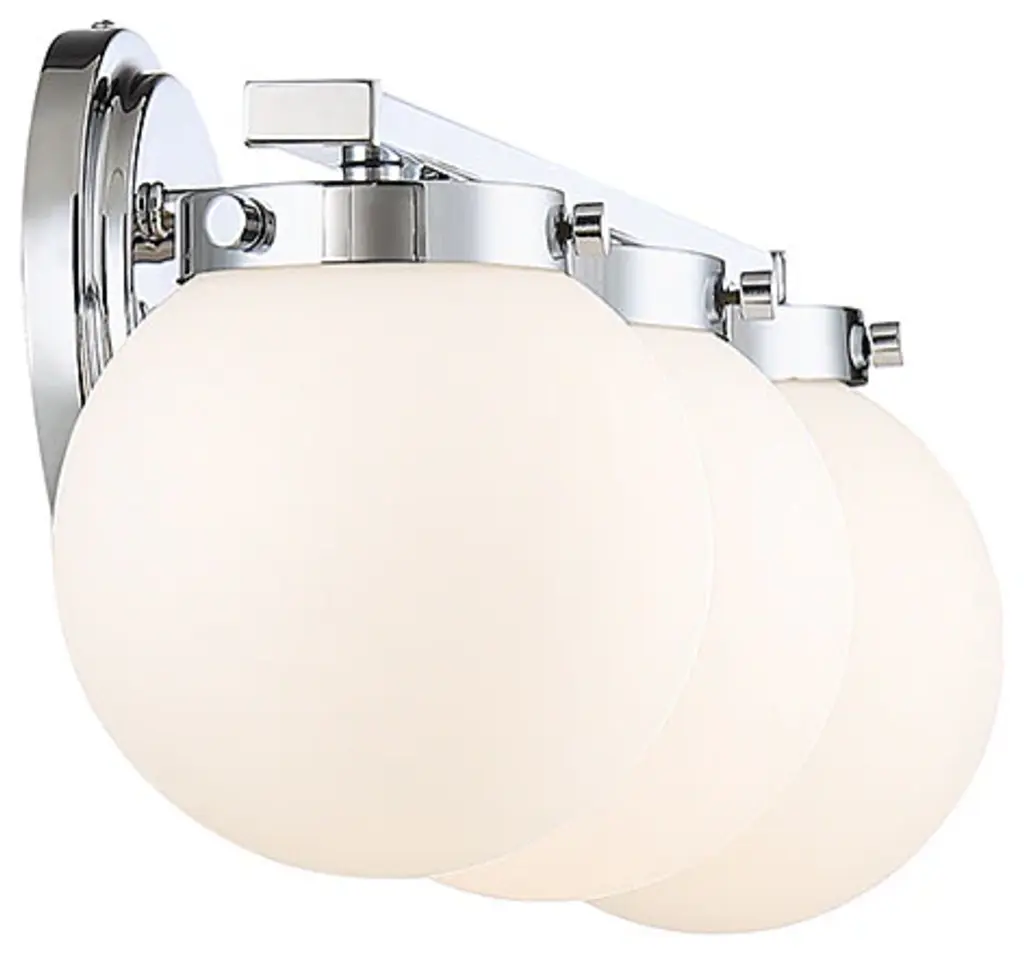Illuminate your bathroom in chic, vintage-inspired style with this three-light vanity fixture. Orb-shaped shades of white opal glass mean you will get bright and comfortable light. The circular backplate echoes the shape of the shades, too. Voltage: 120Number of bulbs: 3Type of bulb: EWattage per bulb: 60Bulb included: NoUL damp locationFinish: ChromeMaterials: Metal and glassBackplate dimensions: W 6.05" x H 0.94"Dimensions: W 24" x H 8"