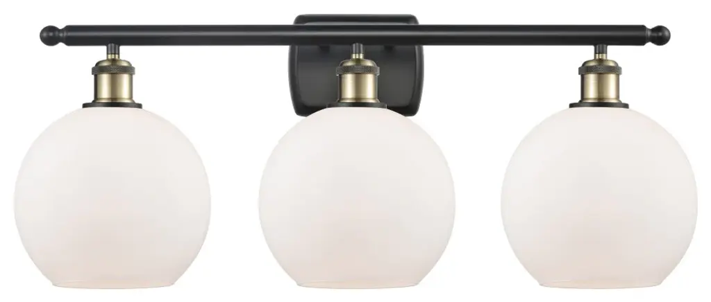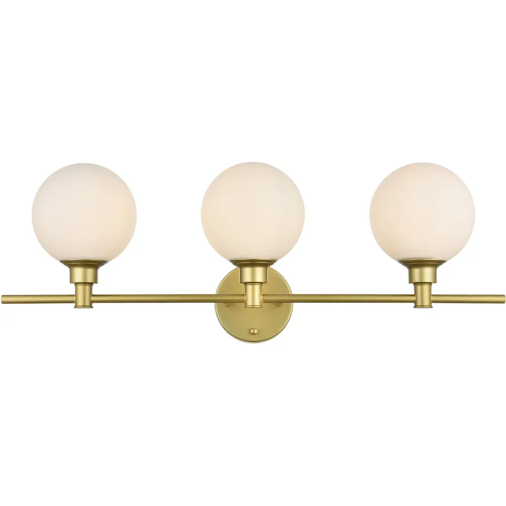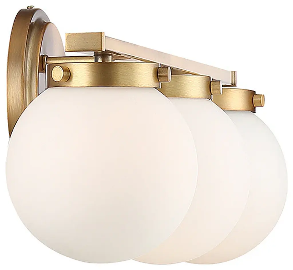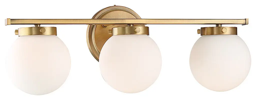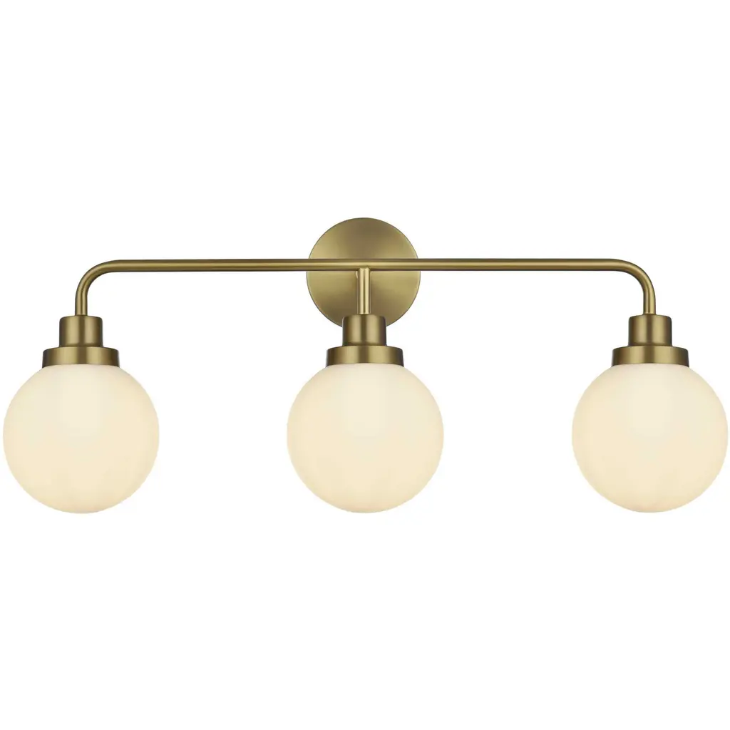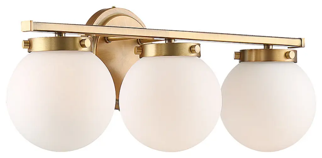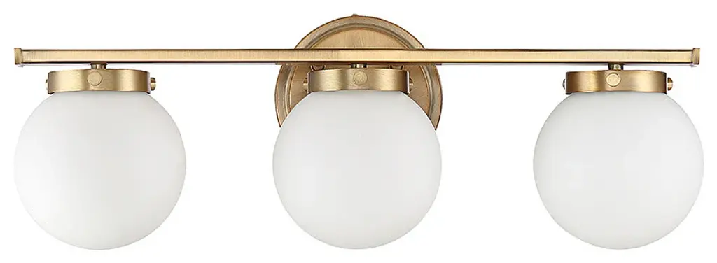 Illuminate your bathroom in chic, vintage-inspired style with this three-light vanity fixture. Orb-shaped shades of white opal glass mean you will get bright and comfortable light. The circular backplate echoes the shape of the shades, too. Voltage: 120Number of bulbs: 3Type of bulb: EWattage per bulb: 60Bulb included: NoUL damp locationFinish: Natural brassMaterials: Metal and glassBackplate dimensions: W 6.05" x H 0.94"Dimensions: W 24" x H 8"
