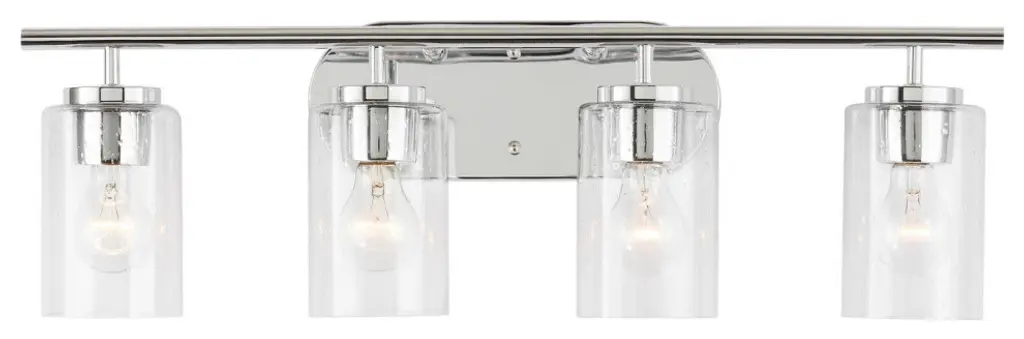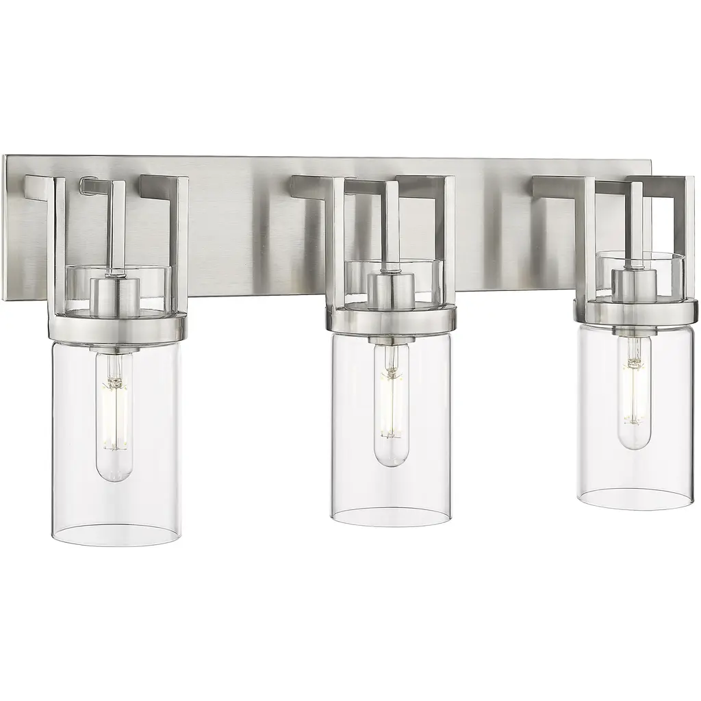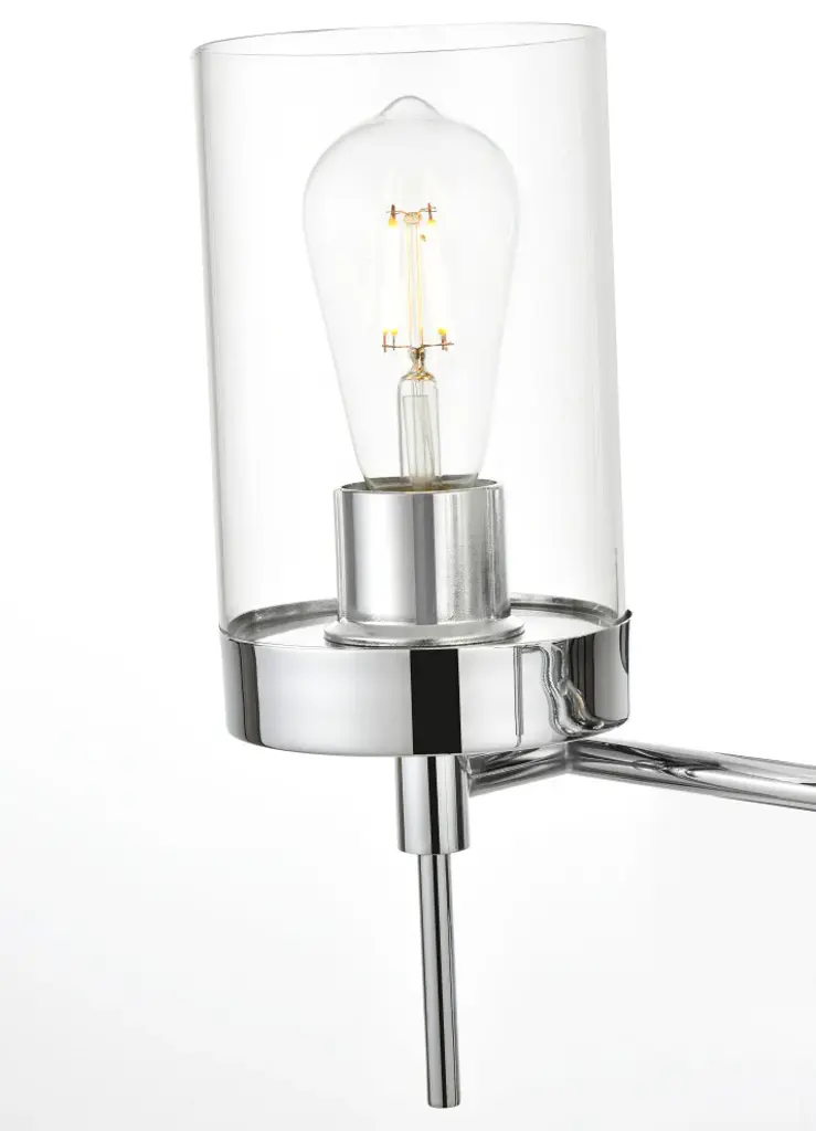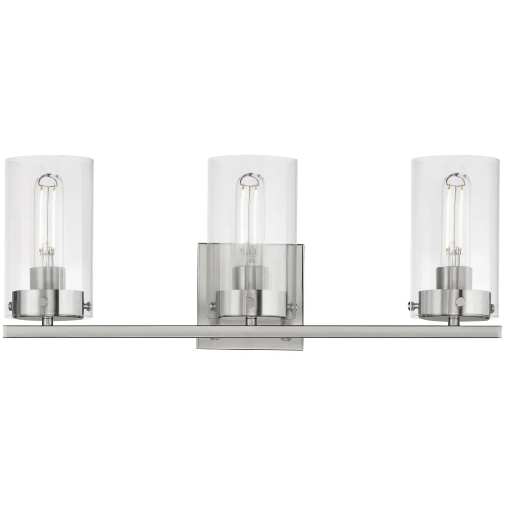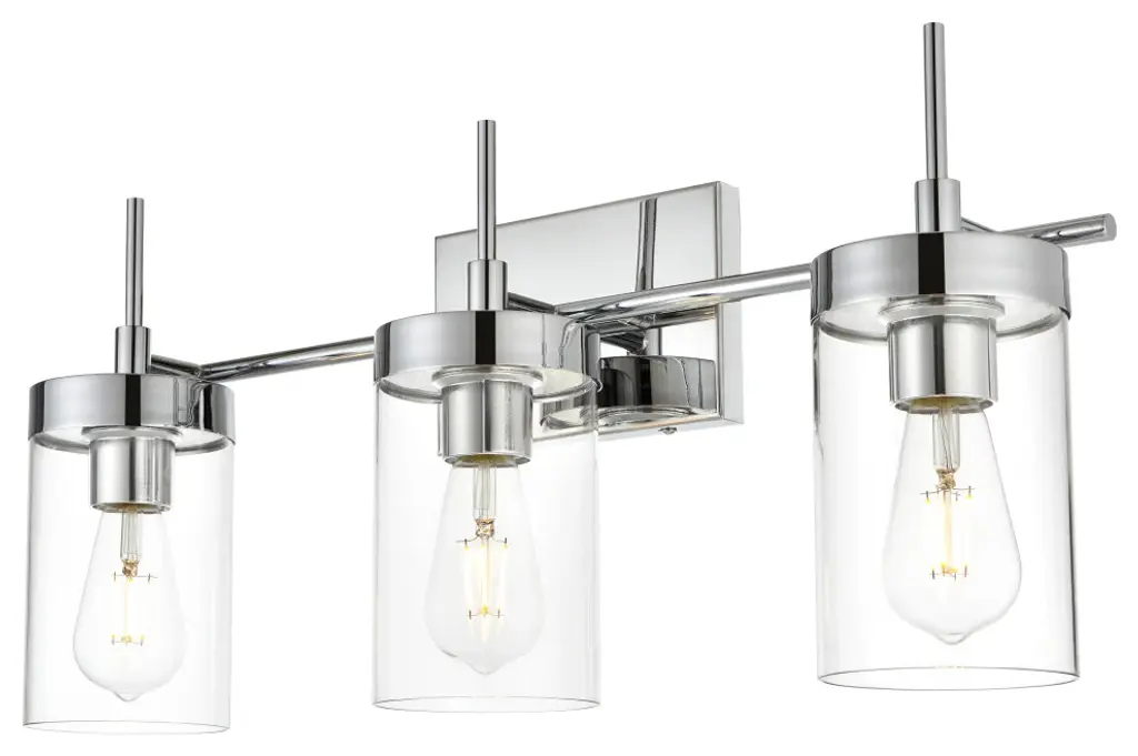 Defined by curved metal arm extends to suspend the clear bell glass shade. A contemporary stunner, it shows off the straight line details from the backplate and the streamline thin metal arm. Compatible with dimmers, so you''ll have the right amount of light in any given time of the day. Completely versatile, you can place this wall light as an uplight or downlight. Rated for use in damp locations, this will work perfectly over a vanity in your bathroom.illuminated by 3 E26 bulbs, light bulbs not includedcrafted with Iron and Glassbackplate measures 7.1 inches wide x 0.8 inches high x 4.7 inches deepcan be installed as an uplight or downlightdimmable, compatible with a dimmer switch (not provided)hardwired, professional installation recommendedClear glass shade filter light from the straight metal armed sconce