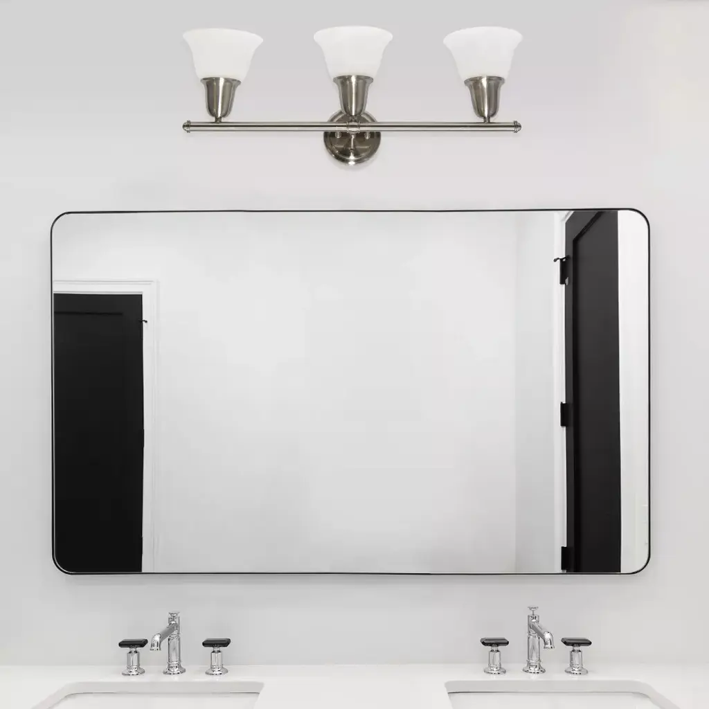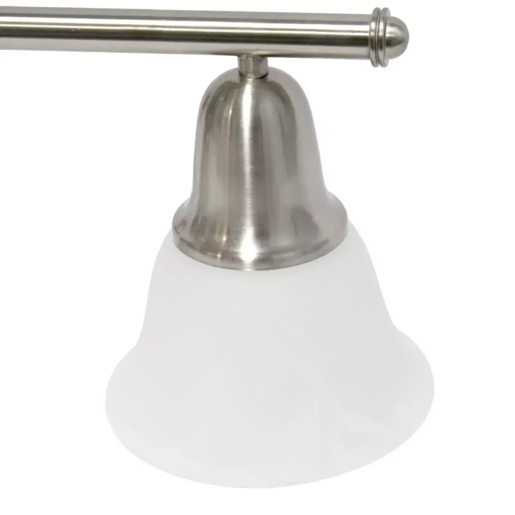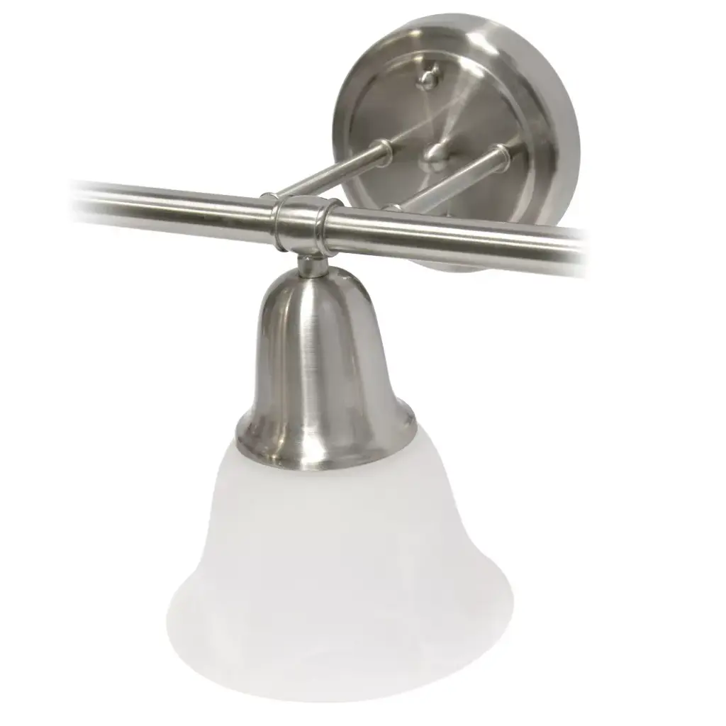 This lovely three light 26.5" vanity fixture has been carefully designed to serve both your lighting and decor needs in a sophisticated and contemporary manner. Three identical alabaster white shades are held in place on a straight metal bar by matching metal socket holders in the finish of your choice. Perfect for your bathroom, hallway, bedroom, foyer, or above your vanity!