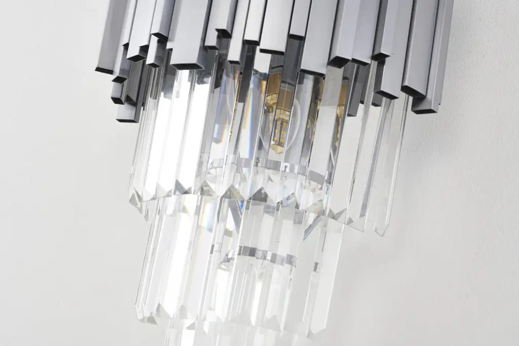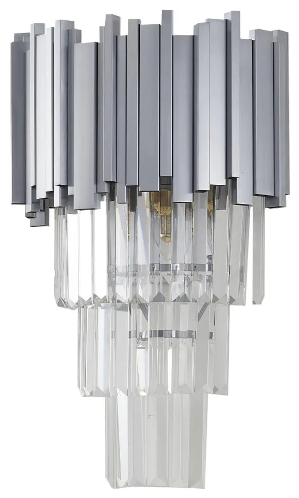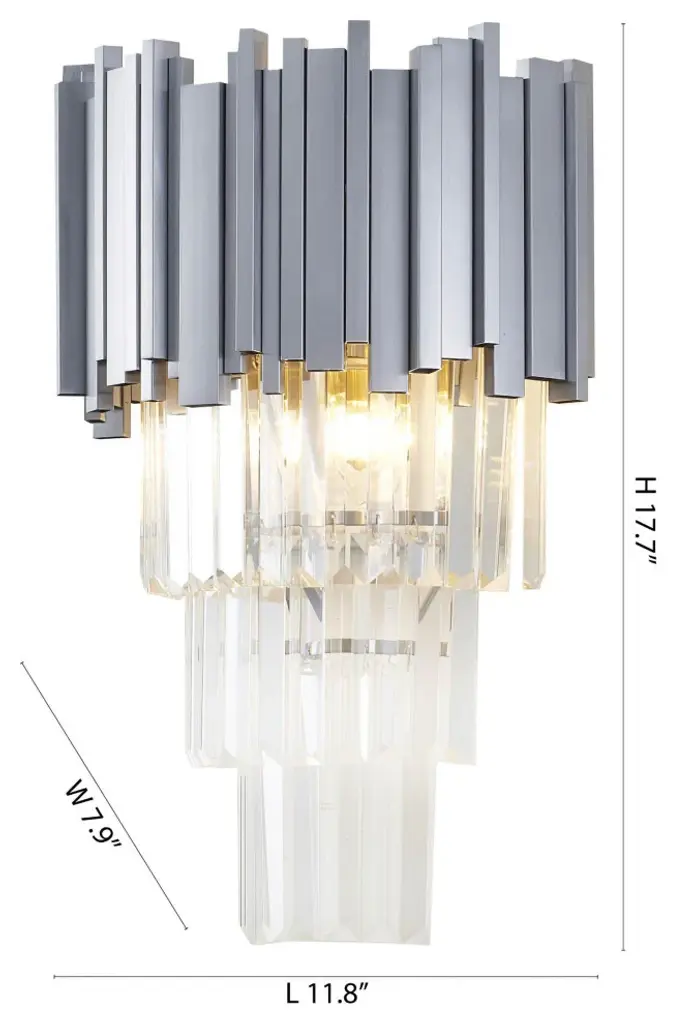 Contemporary lines, ultra-sleek and high quality elegant finishes. This wall sconce features clear hanging crystals, vertically seated on a satin nickel stainless steel frame. If you are looking for a light source for your bedroom, living room, entryway, or foyer, this wall sconce can easily fit into your modern home decor