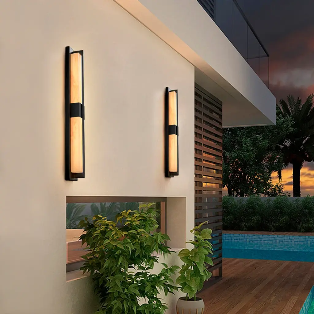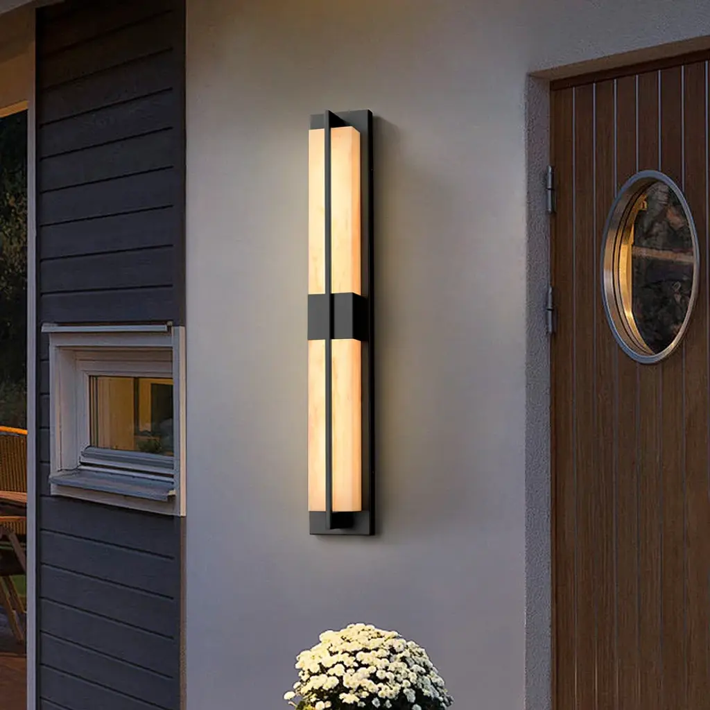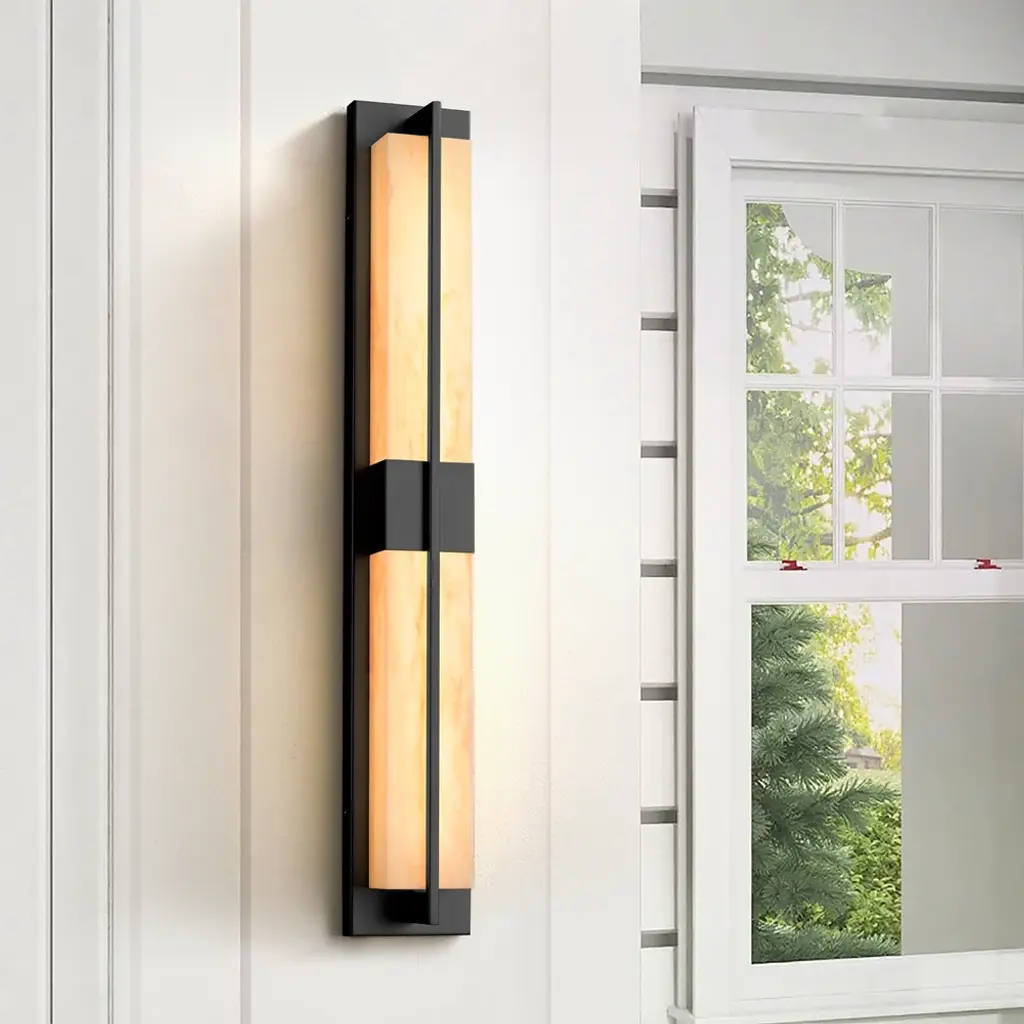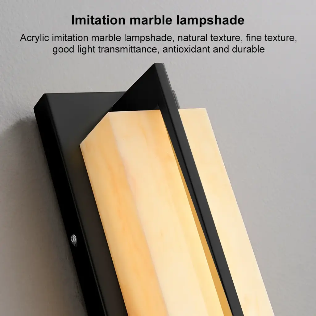 31" Outdoor Wall Light With Matte Black Iron Frame & Beige Marble-Effect Acrylic Shade