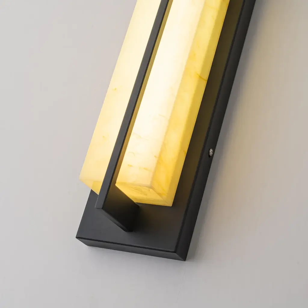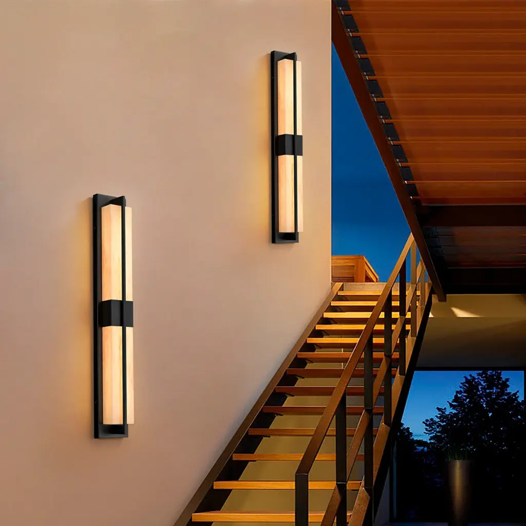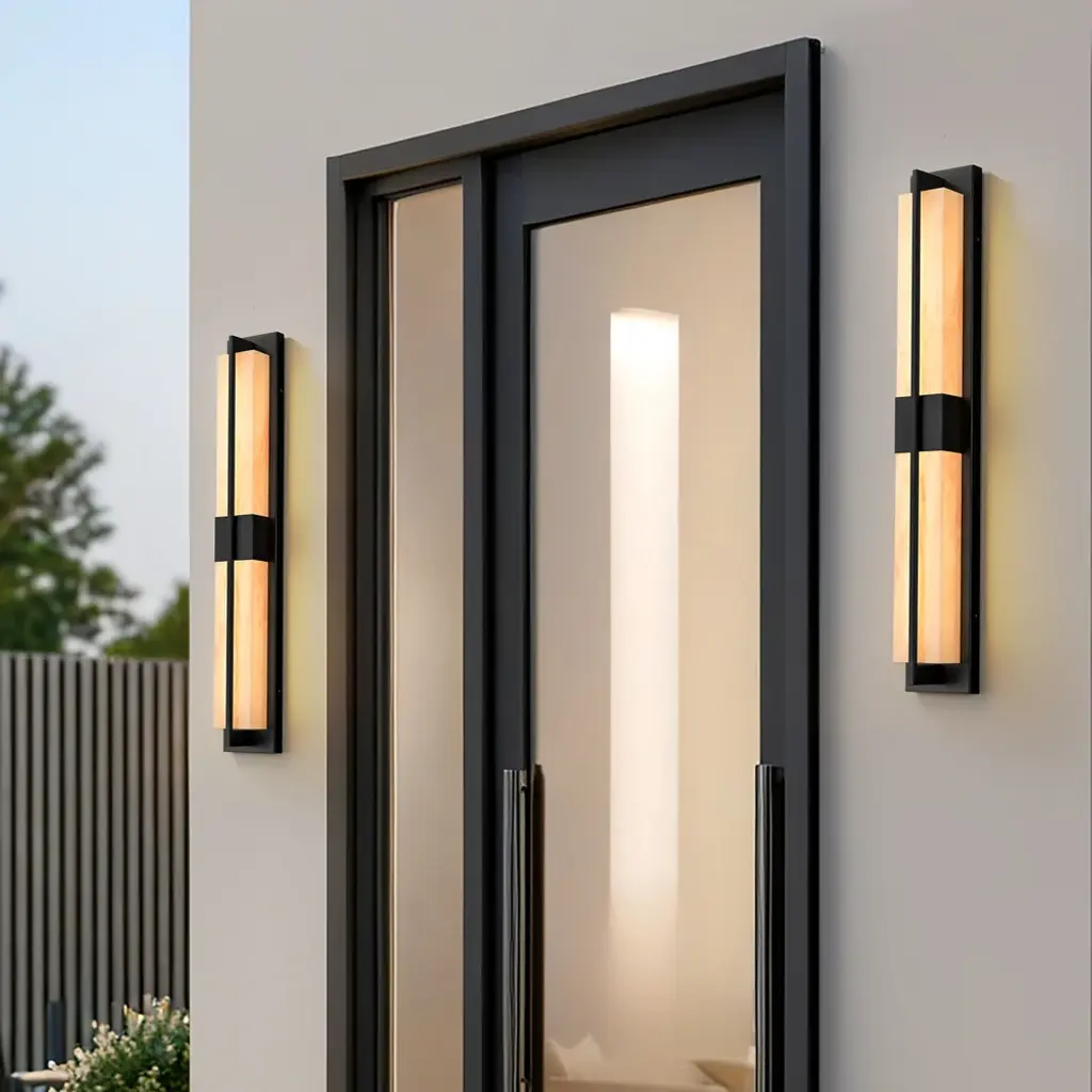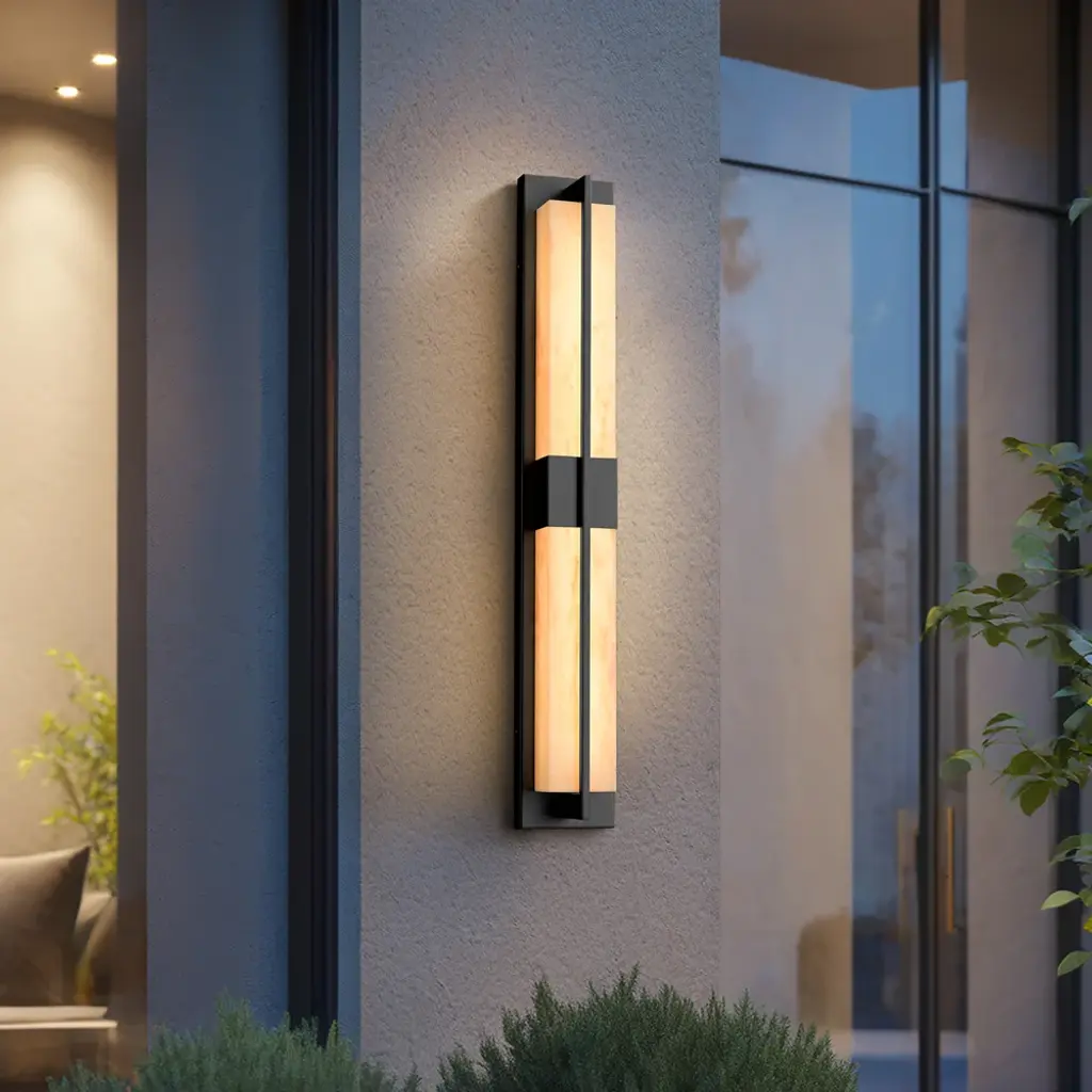 31" Outdoor Wall Light With Matte Black Iron Frame & Beige Marble-Effect Acrylic Shade