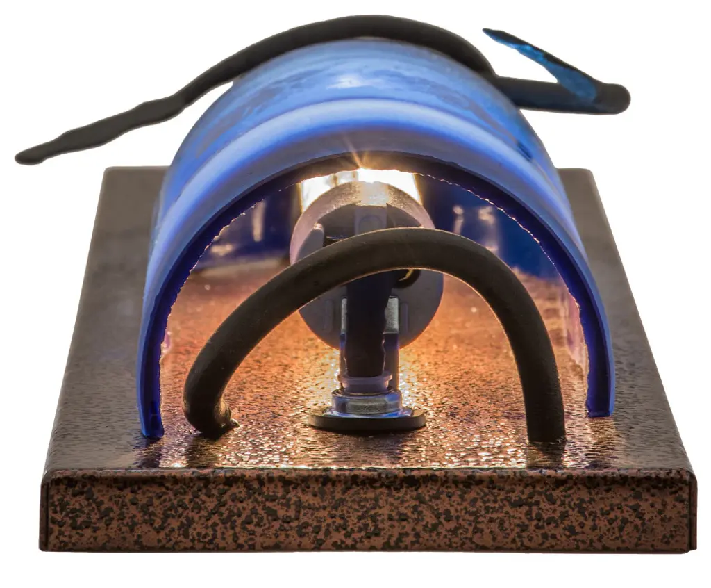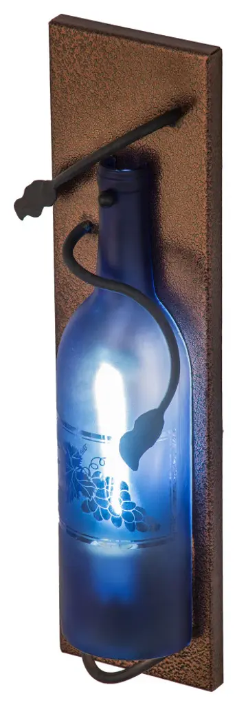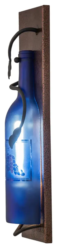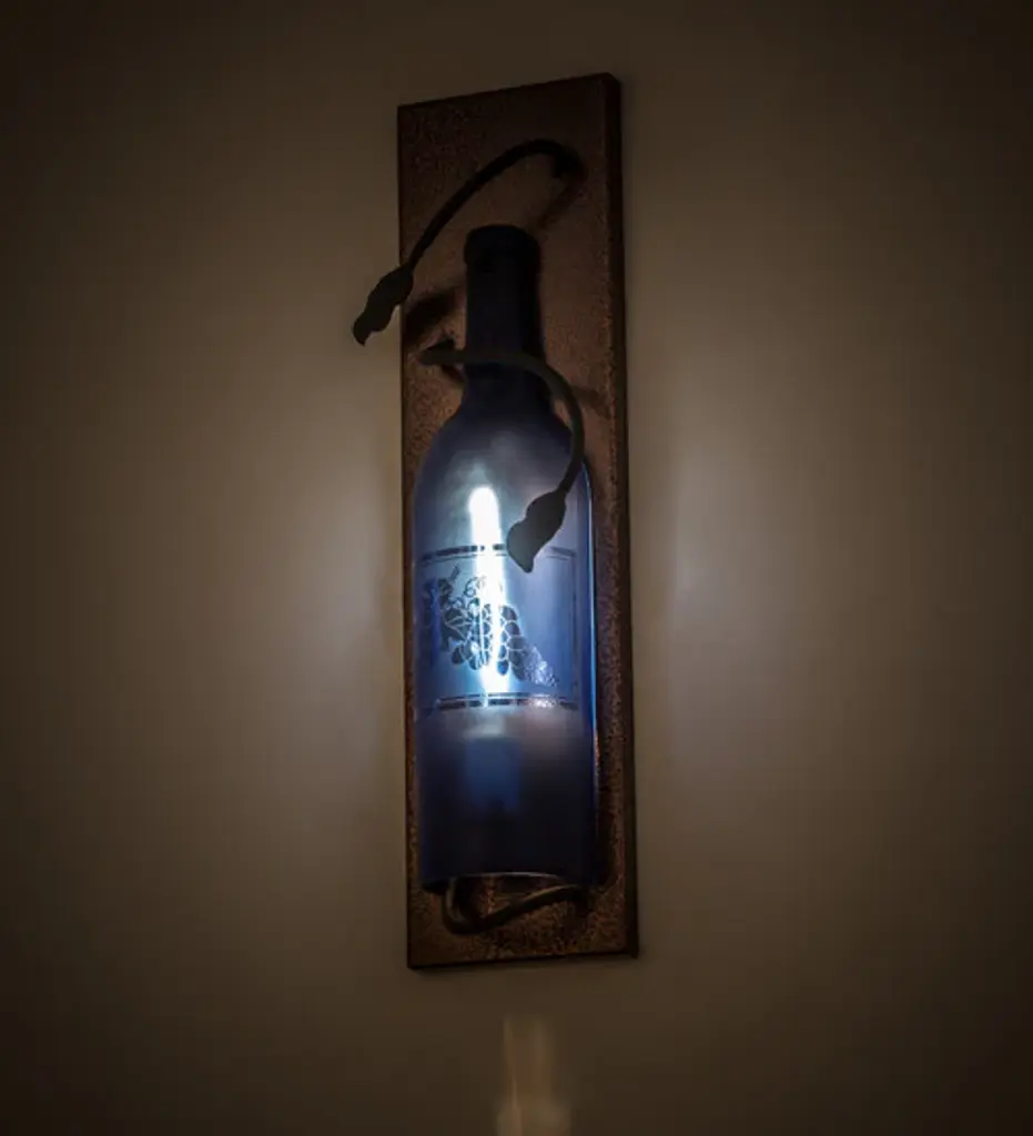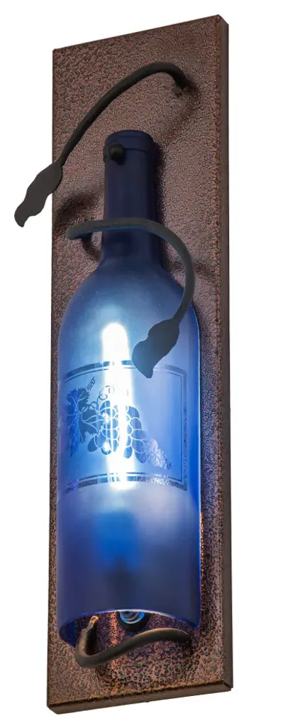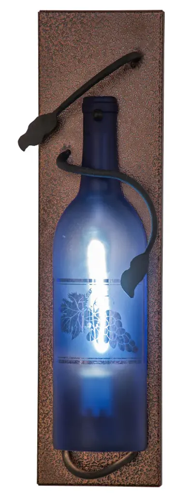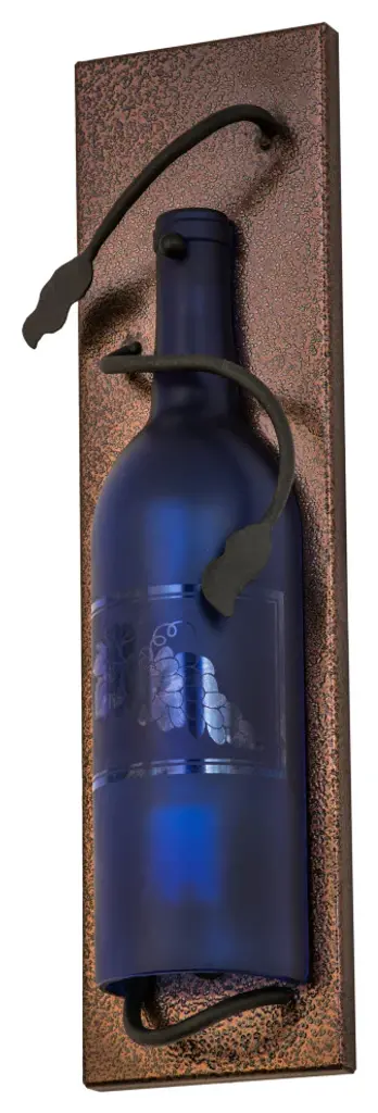 Capture the mood or life of any party with authentic wine bottle lighting. This wall fixture does so much more than deliver light; it adds personality and pizazz to any interior. A hand forged Black vine and leaf coil is designed around the neck of this stunning Blue Glass wine bottle; which illuminates and features a stunning etched Grape design. The sconce is complemented with handsome hardware featured in a Copper Vein finish. Perfect for homes; restaurants; hotels; pubs; nightclubs; wineries; and retailers; this sconce is handmade by Meyda artisans in our manufacturing facilities in upstate New York. Custom colors; styles; sizes and dimmable energy efficient lamping options. UL and cUL listed for damp and dry locations.