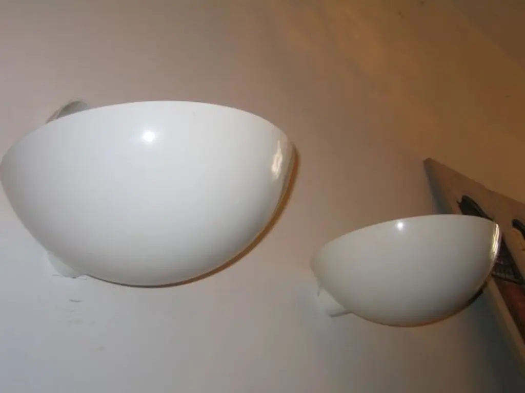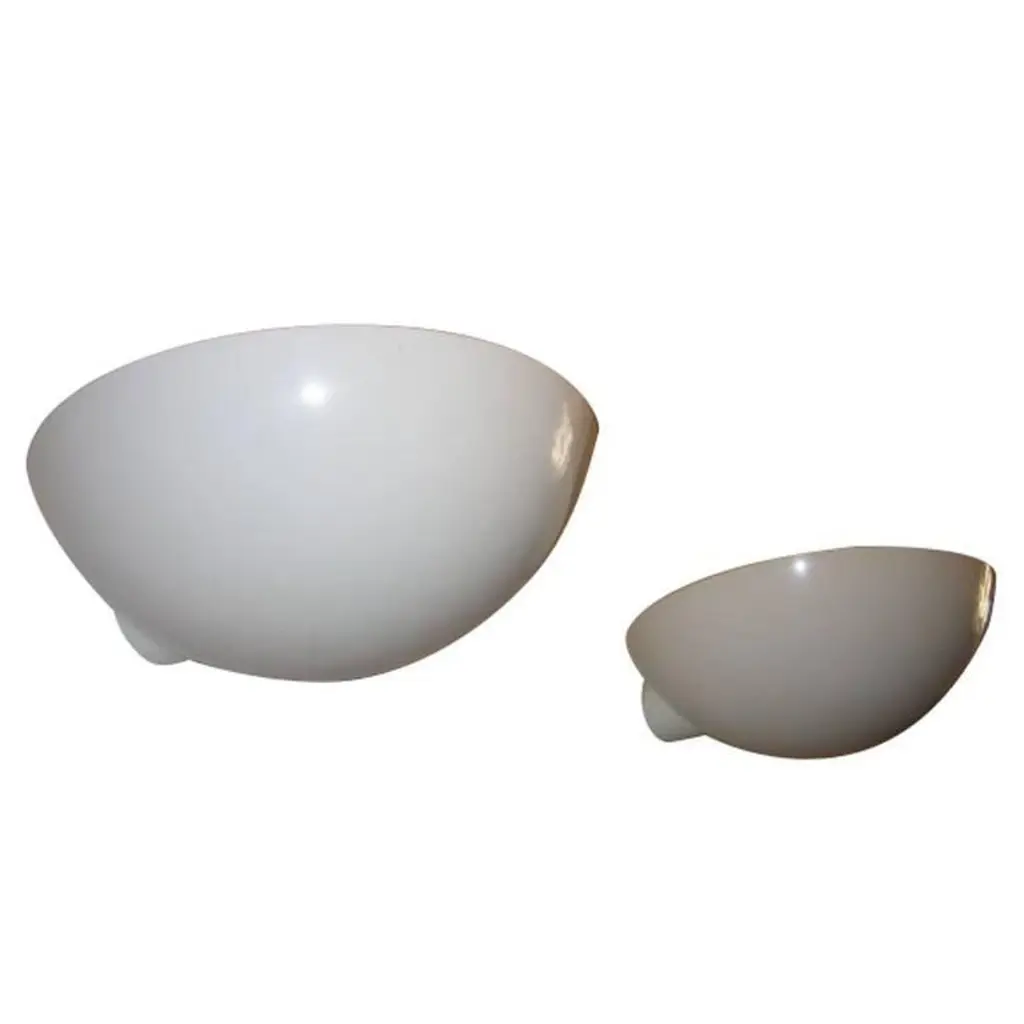 Four sober and elegant Italian Space Age white enameled metal wall lights in the form of a demilune and capable of providing subtle light to a large area. There are both simple and striking, a clean and practical modern statement.Priced individually.