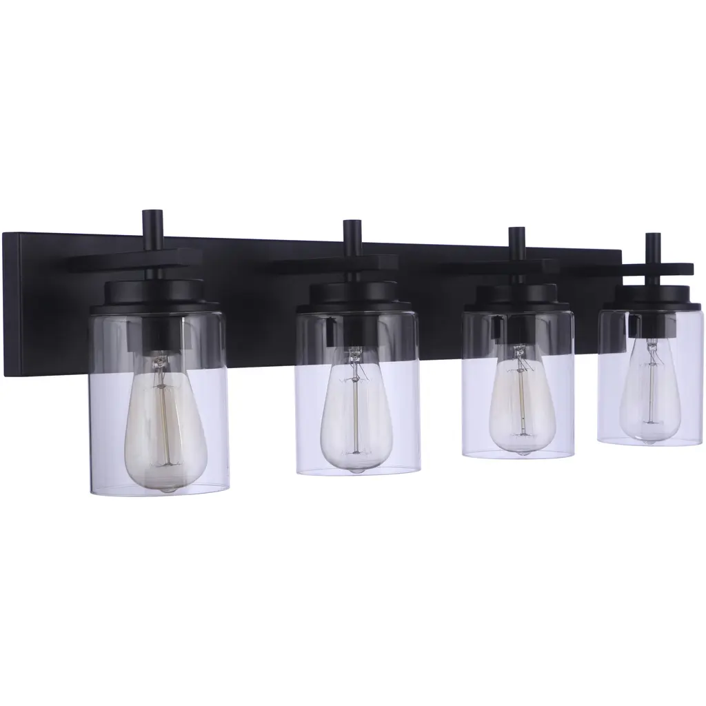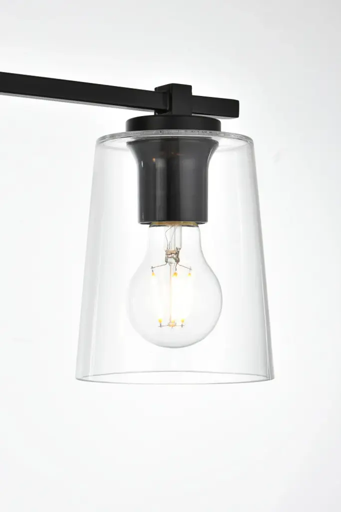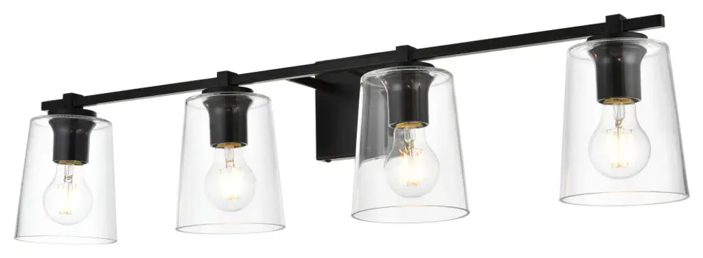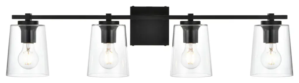 Defined by a sleek metal arm extends to suspend the clear bell glass shade. A contemporary stunner, it shows off the straight line details from the backplate and the streamline thin metal arm. Compatible with dimmers, so you''ll have the right amount of light in any given time of the day. Completely versatile, you can place this wall light as an uplight or downlight. Rated for use in damp locations, this will work perfectly over a vanity in your bathroom.illuminated by 4 E26 bulbs, light bulbs not includedcrafted with Iron and Glassbackplate measures 4.7 inches wide x 0.8 inches high x 4.7 inches deepcan be installed as an uplight or downlightdimmable, compatible with a dimmer switch (not provided)hardwired, professional installation recommendedclear glass shade filter light from the straight metal armed sconce