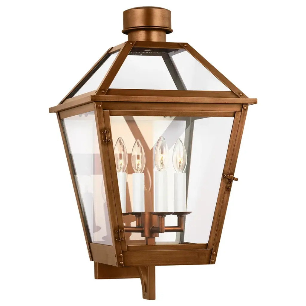The Hyannis four-light outdoor wall fixture by Chapman & Myers has a classic lantern profile with top and bottom glass panels. Assembled with an overlapping frame that is accented by rivet details. Each light has a historically inspired spun chimney cap. The sconces are supported by a traditional bent architectural bracket.
