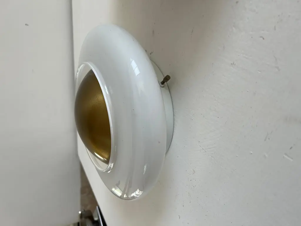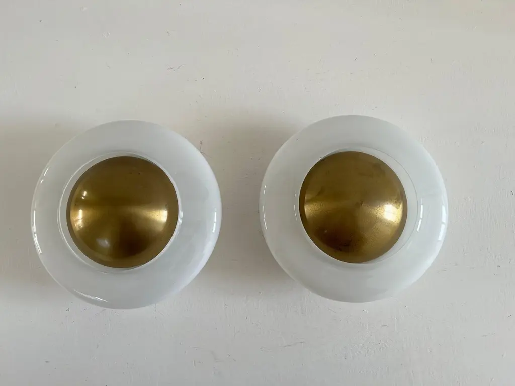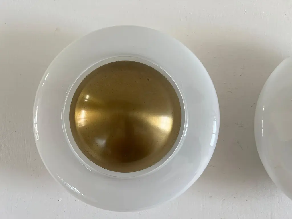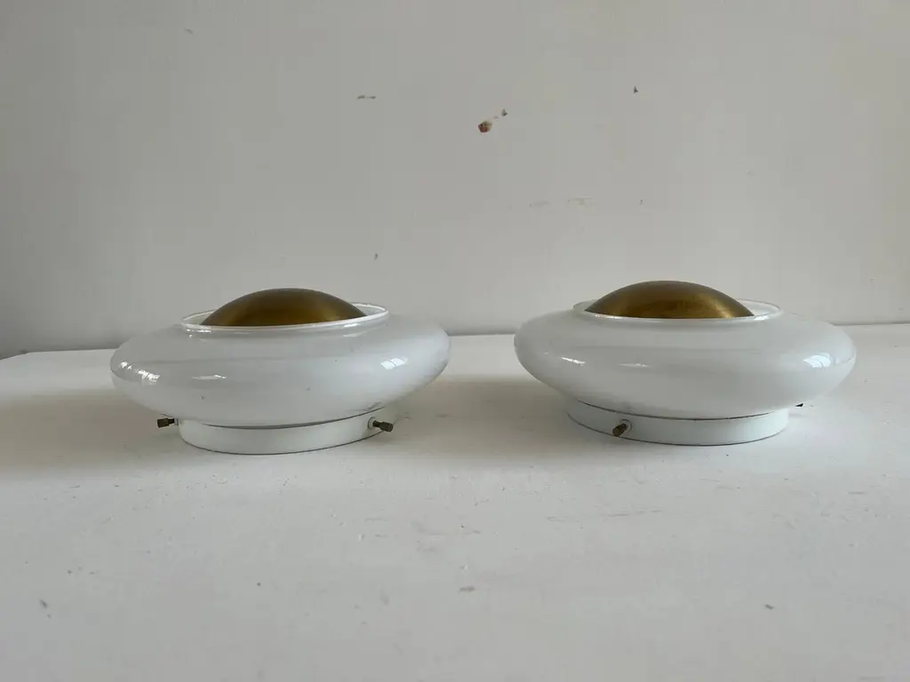 4 Mid-Century Modern Flush Mounts or sconces by Valenti made in Italy circa 1960 and produced in blown glass and brass.Both still retain their papel labels.Each holds two e14 bulbs. Priced individually.