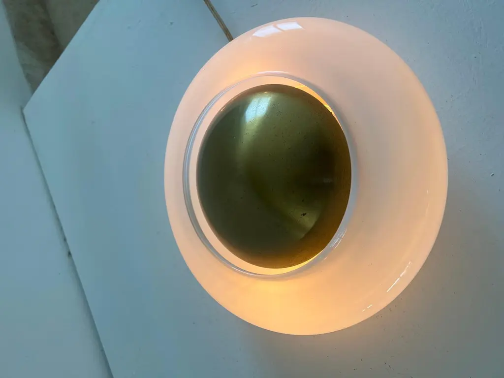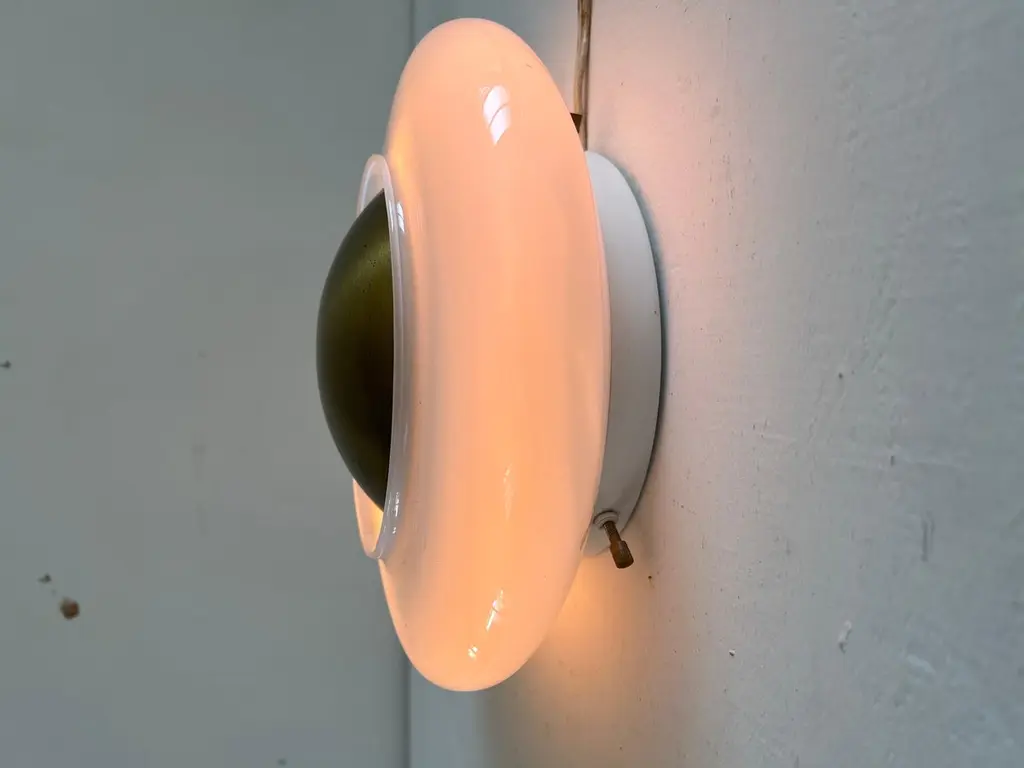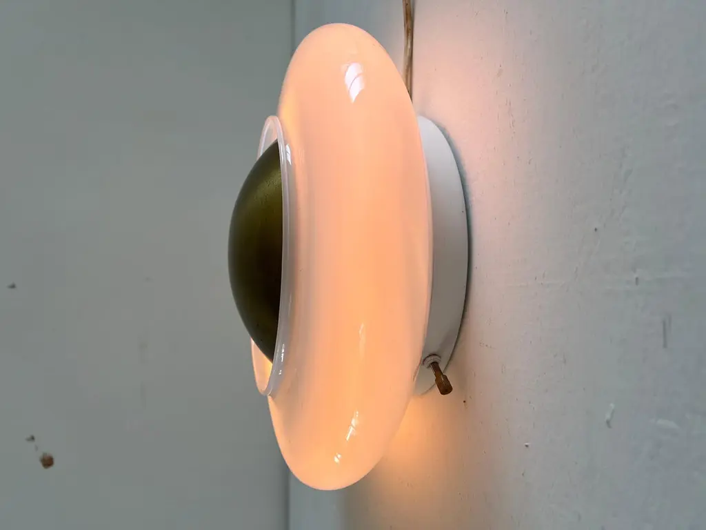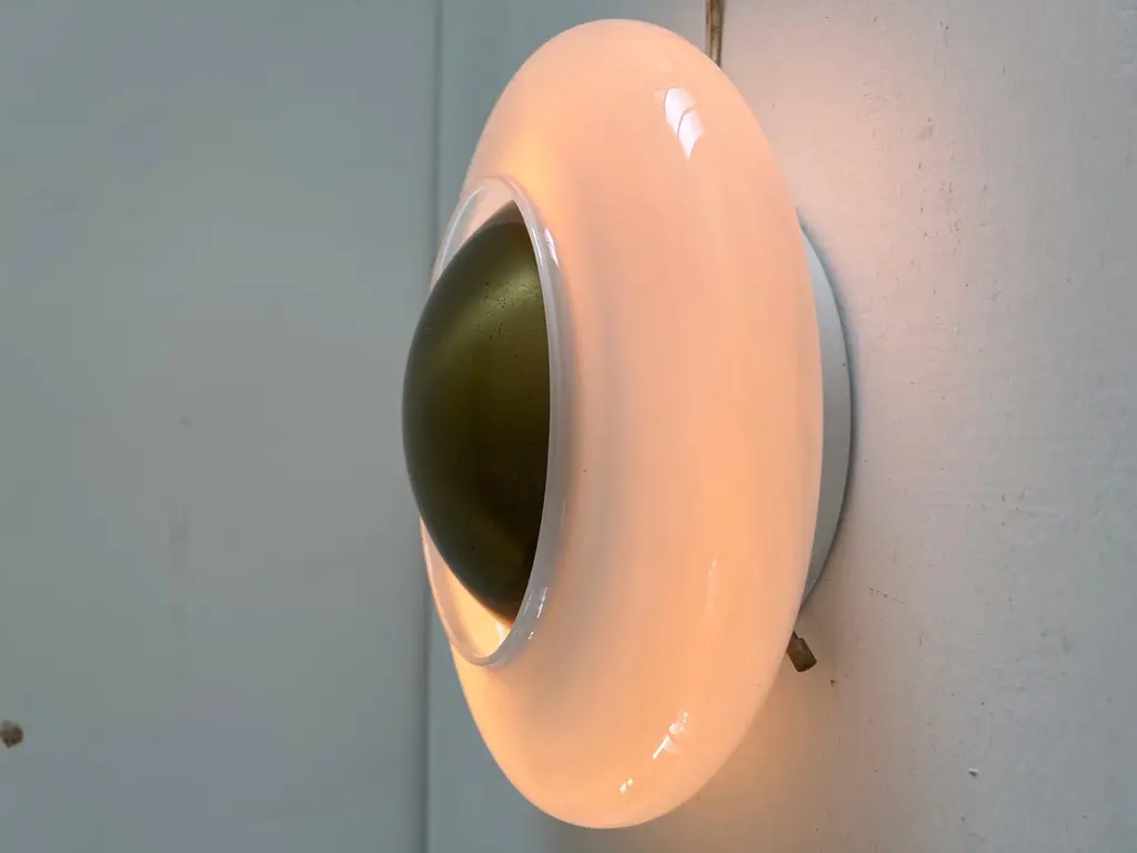 4 Mid-Century Modern Flush Mounts or sconces by Valenti made in Italy circa 1960 and produced in blown glass and brass.Both still retain their papel labels.Each holds two e14 bulbs. Priced individually.