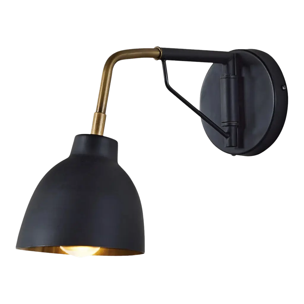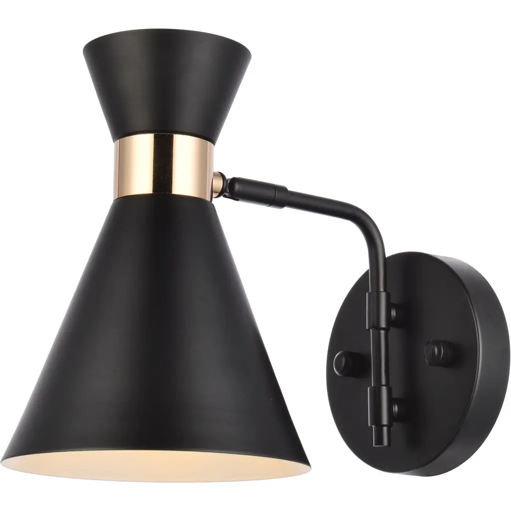 The perfect light fixture for modern, vintage-inspired homes, this sophisticated sconce allows for directing the light where desired by simply adjusting its bright ball joints. Its sturdy iron structure lacquered in black offers an unexpected touch of opulence with the golden finish covering the interior of its conical shade. Ideally displayed with a twin at the sides of a double bed.