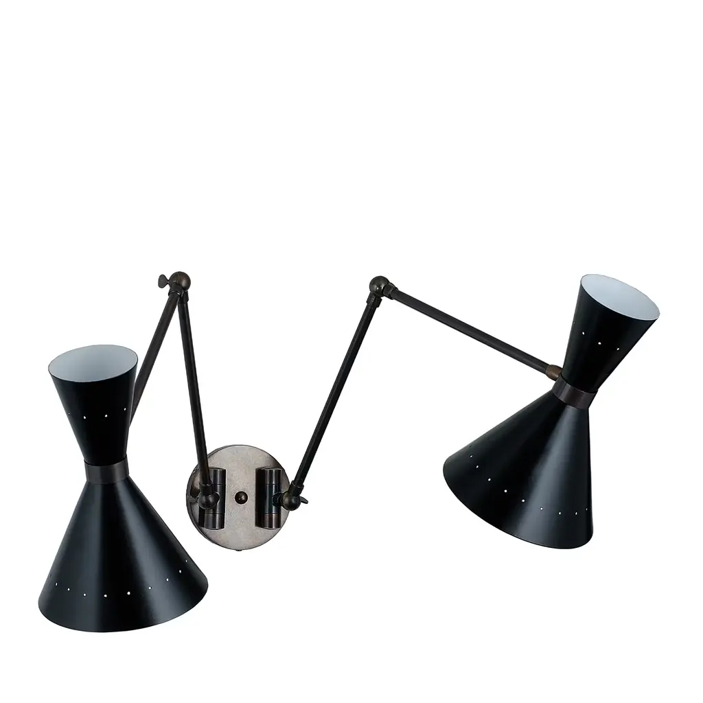 The endless elegance of minimalist design is impeccably exemplified by this wall lamp, a fine solution best suspended over a bookcase or accent table. Attached to the wall by means of a rectangular plate, it features two angular arms in different heights that connect it to the shades, consisting of two conical elements and internally accented with a golden shade for a subtle accent of luxury. Two GU10 bulbs are required.
