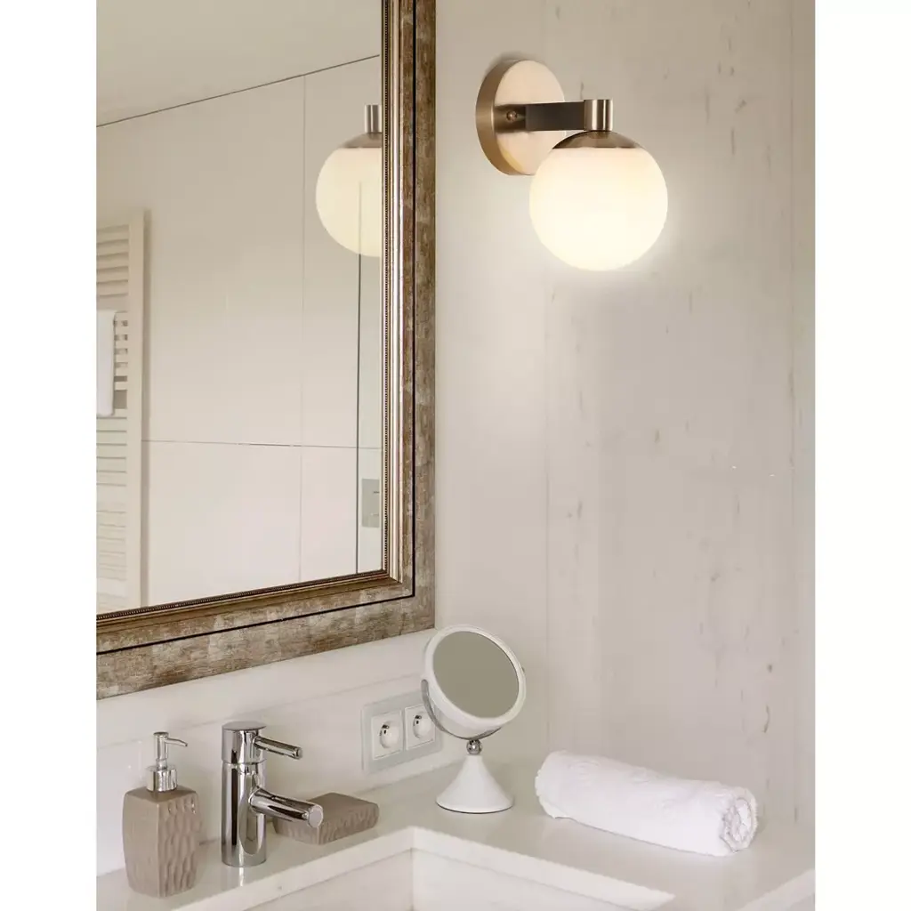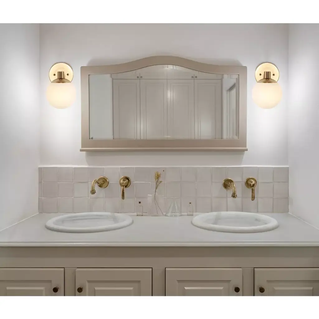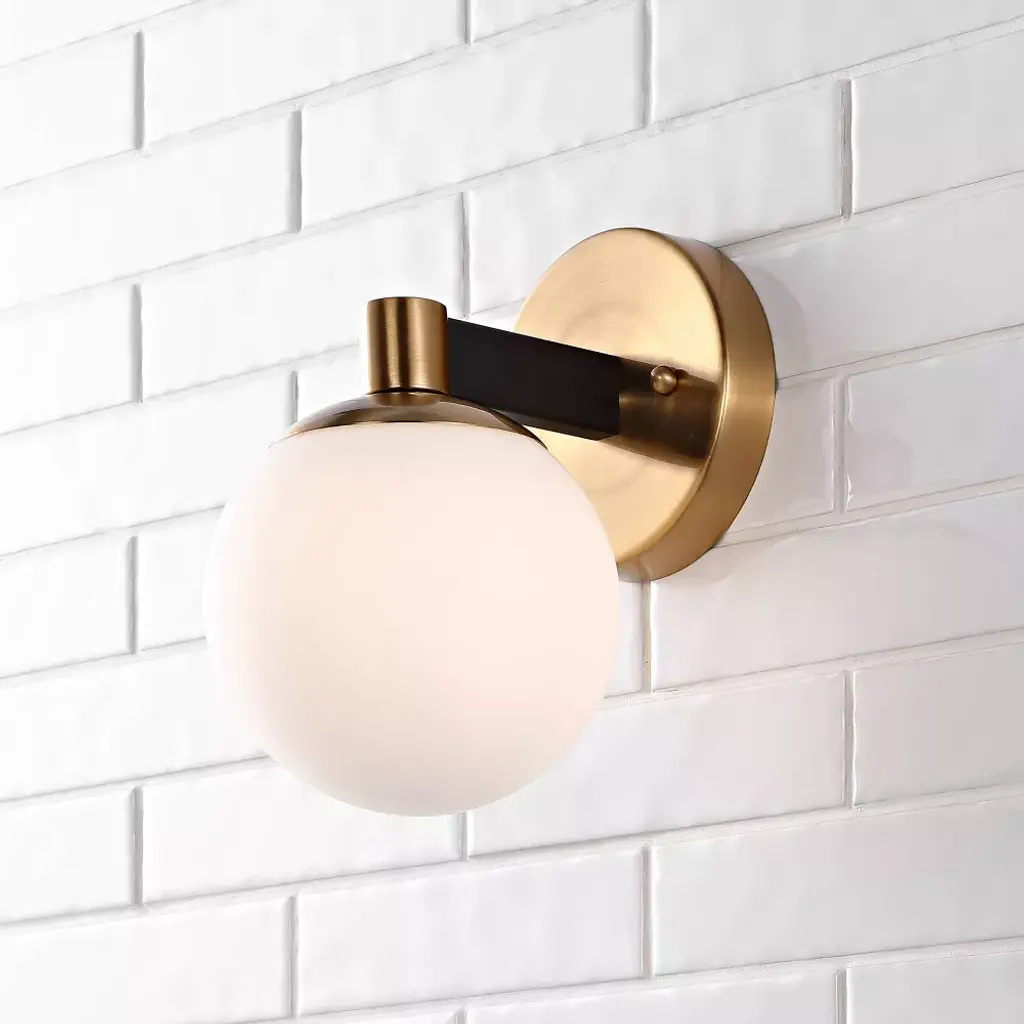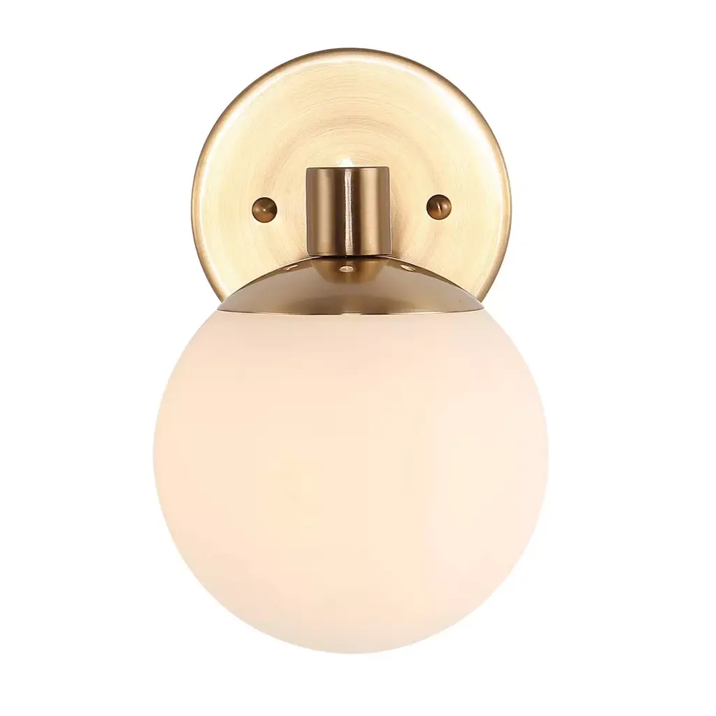 Classic style meets modernism with our Art Deco-inspired frosted globe wall light. A single LED light casts a warm glow, providing plenty of light. The rich brass-gold finish adds vintage style to your bath vanity, kitchen, hallway or entry. Replace outdated wall sconces or vanity lights with this Art Deco classic for an instant midcentury style makeover. Our light fixtures work with LED-compatible dimmers; professional installation is recommended. Takes 1 bulb and compatible with 5W LED or 25W Type "A" or 5W CFL. Eco-friendly 4W LED bulb included. As this fixture must be hardwired, we recommend a professional electrician manage installation. Color Temperature: 2700K. CRI: 80. Before cleaning any lamp shade or fixture, disconnect the power source. Wipe with a soft, dry cloth. Avoid the use of chemicals and household cleaners as they may damage the finish.