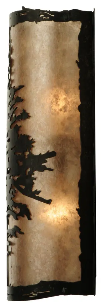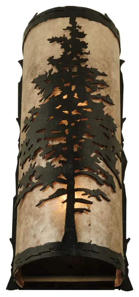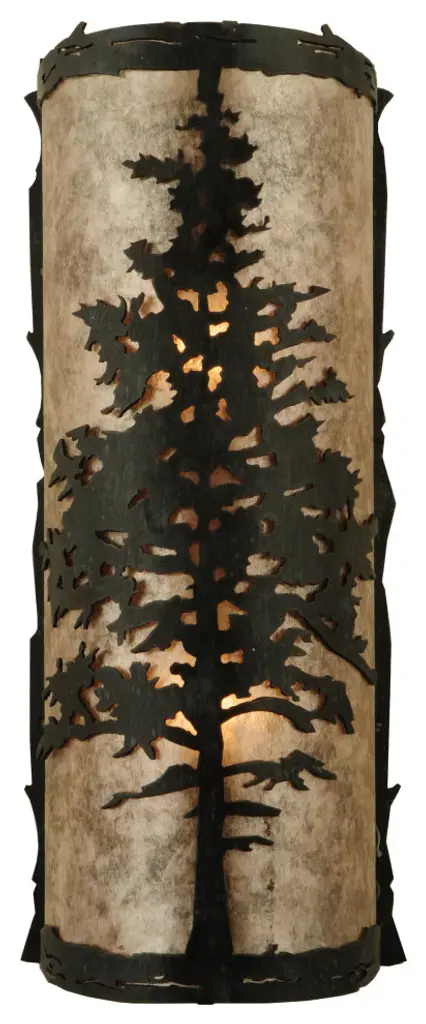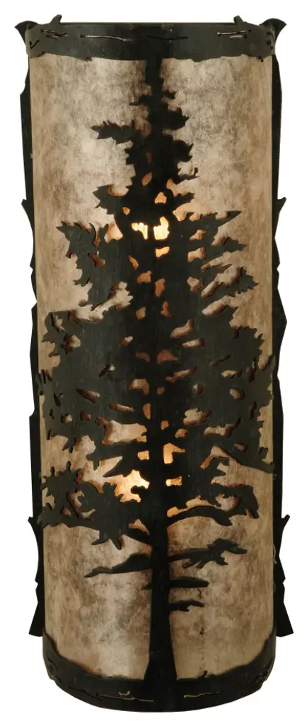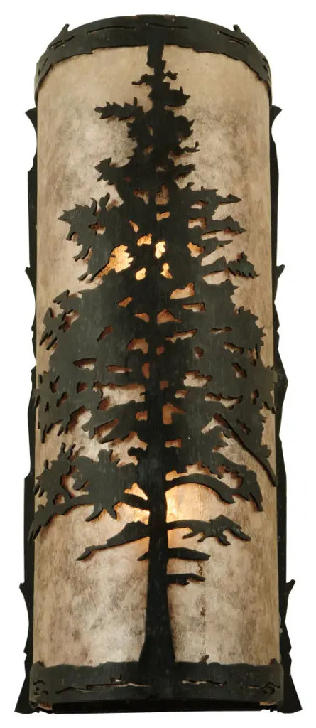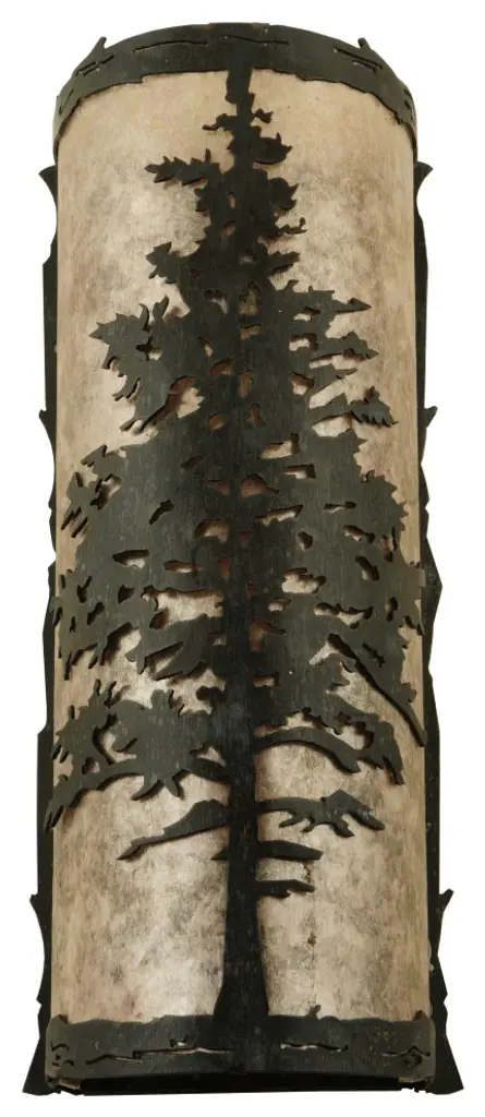 A majestic Tamarack tree is highlighted as the brilliant sun shines in the late morning sky. The Silver Mica diffuser complements decorative accents; frame and hardware featured in a Wrought Iron finish. Custom crafted by highly skilled artisans; the curved wall fixture is created in our manufacturing facility at the foothills of the spectacular Adirondack Mountains in the USA Custom styles; sizes and colors are available; as well as dimmable lamping options. The sconce is UL and cUL listed for damp and dry locations.