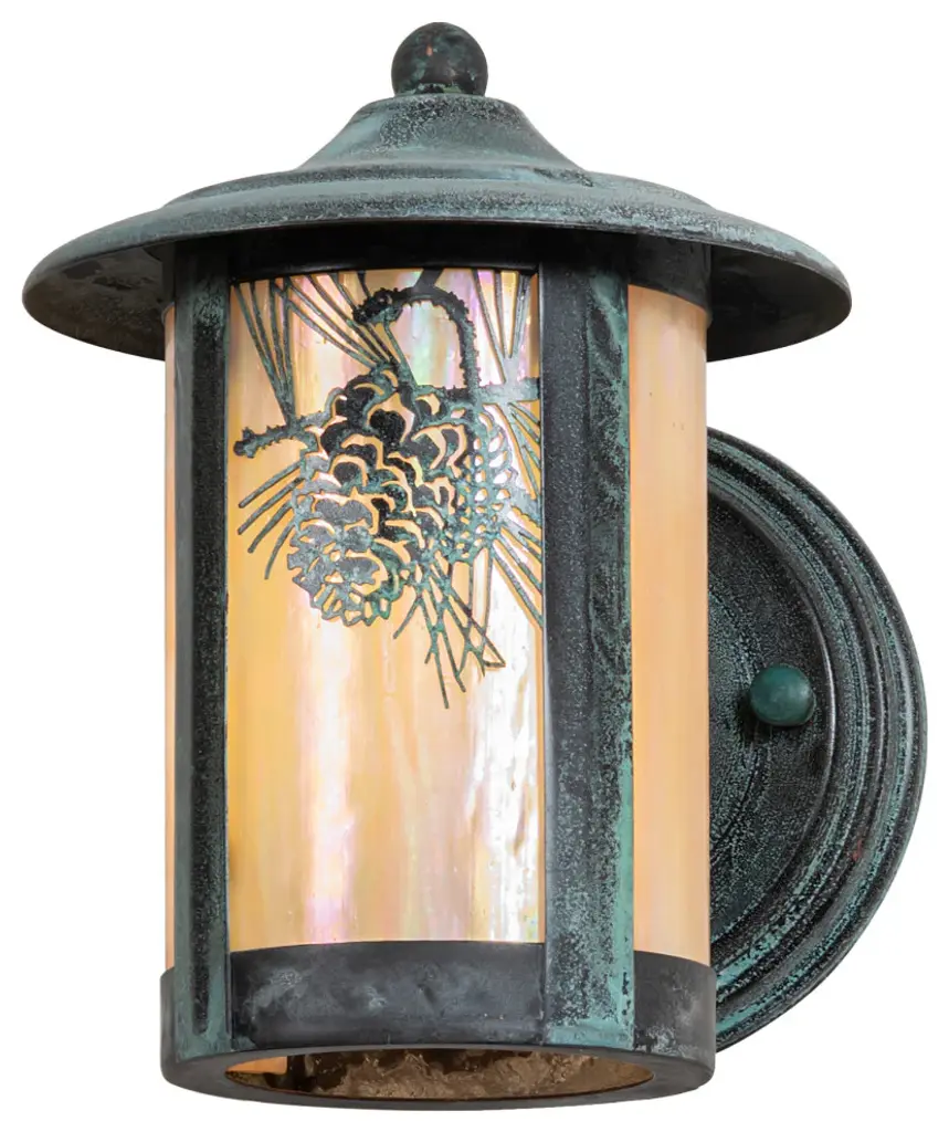 The material is Brass and Glass. The finish is Craftsman Verdigris. The glass is Beige Iridescent.