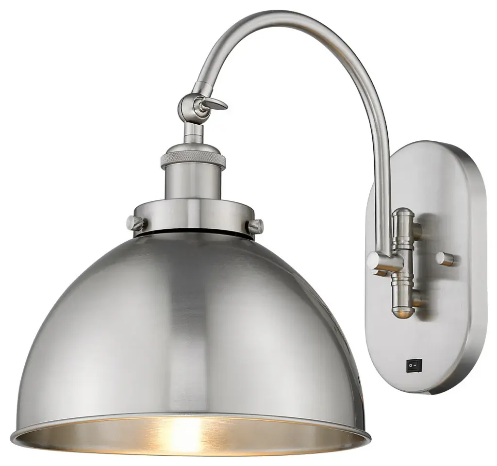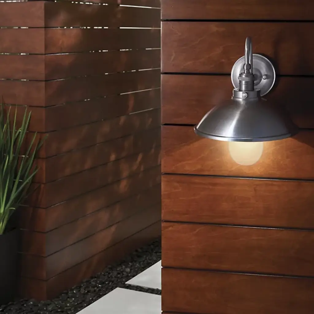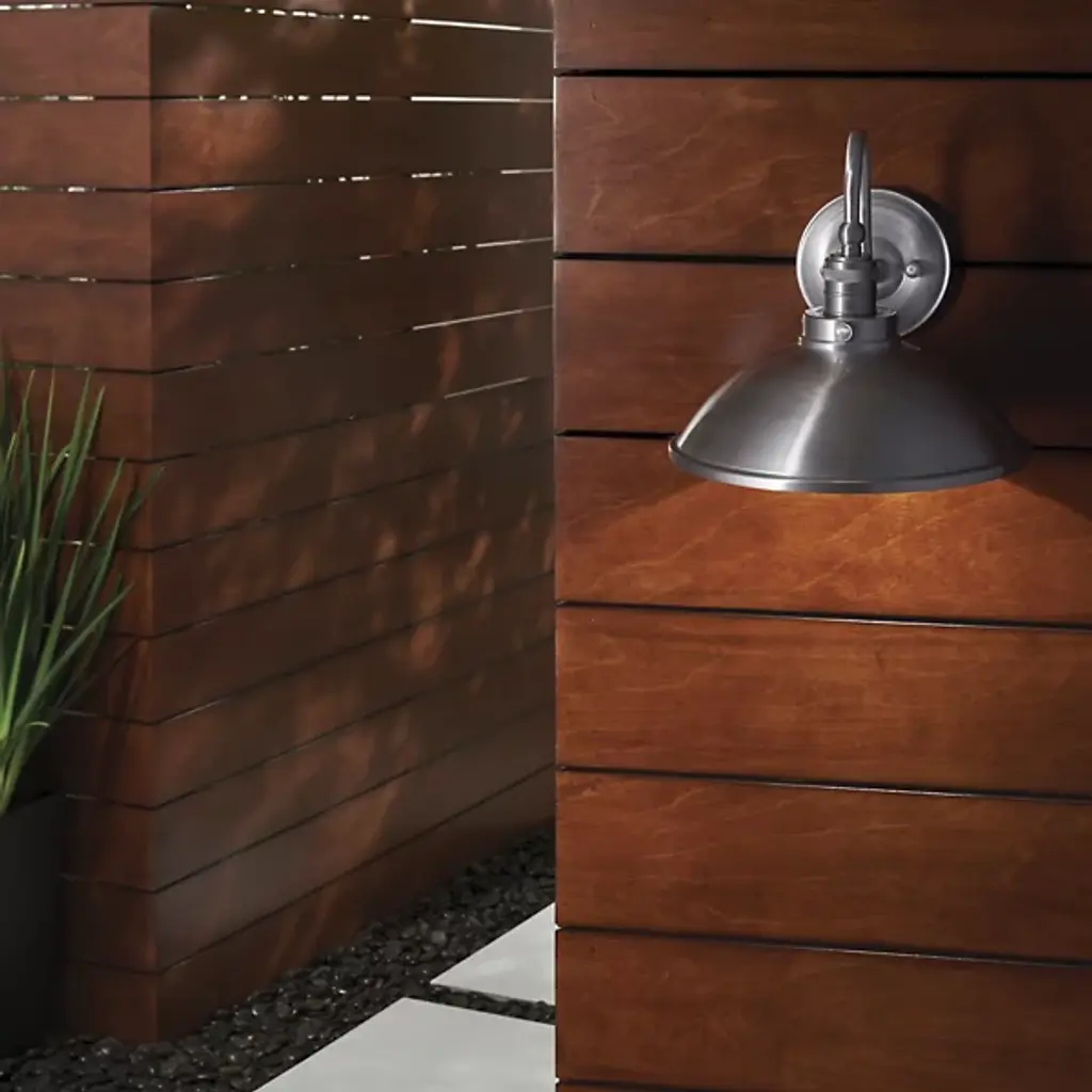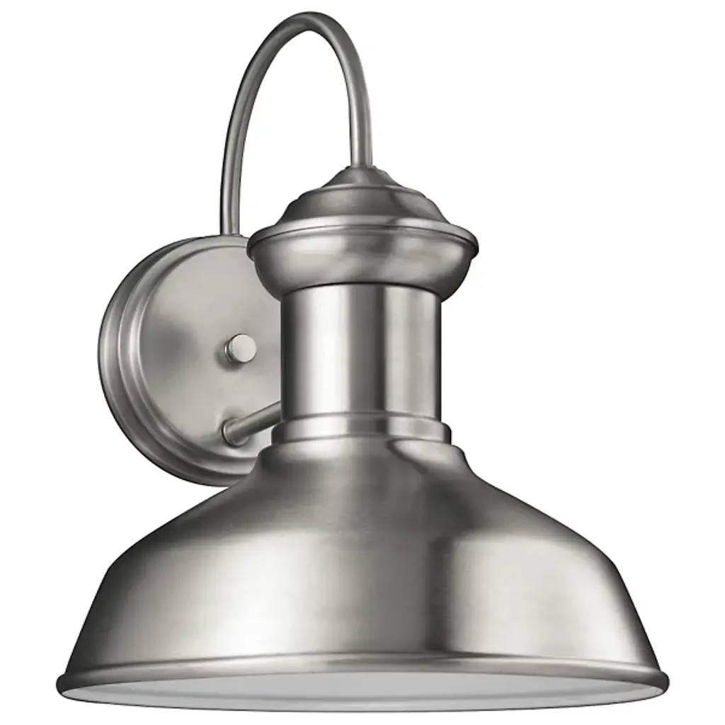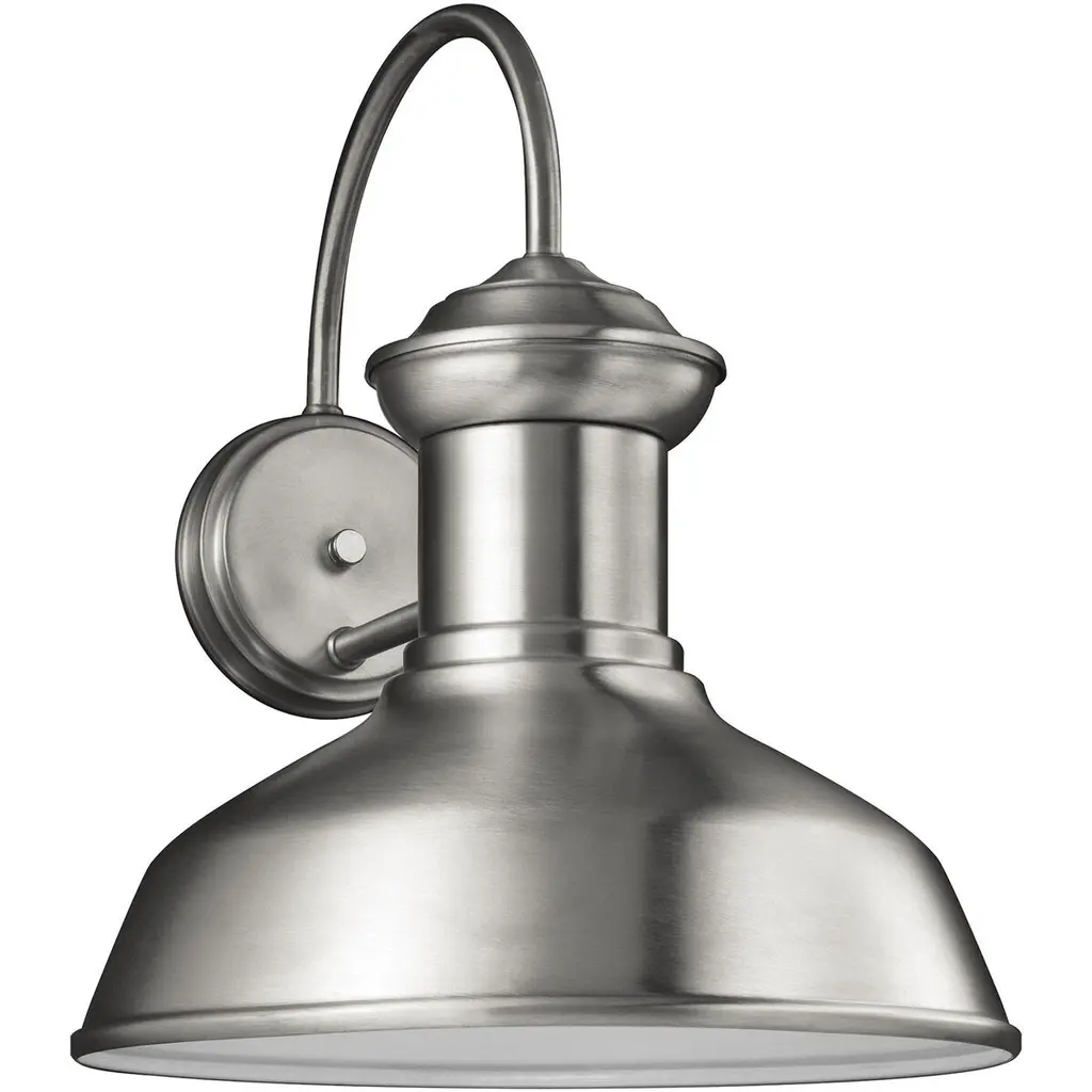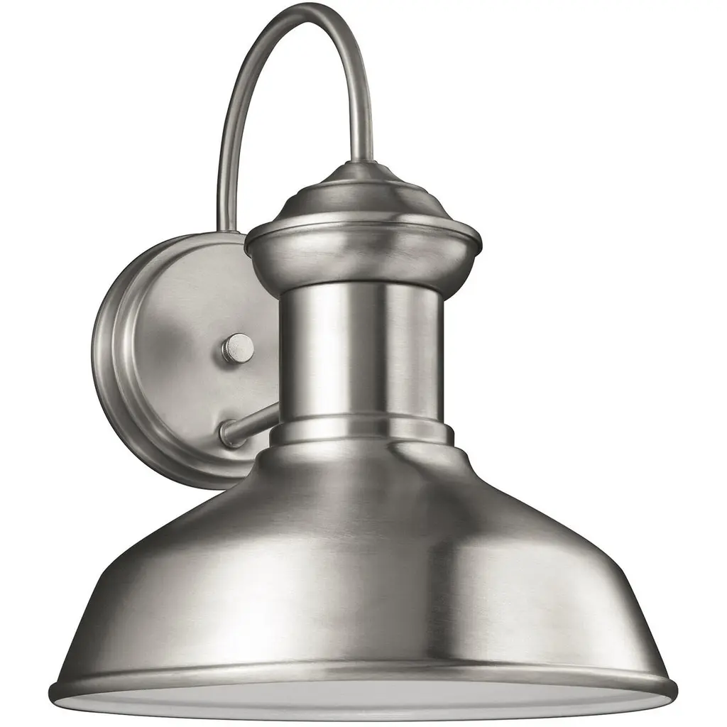 Simple and sleek, the Baytree Lane LED Outdoor Wall Sconce from The Great Outdoors brings a clean and even layer of light to the outside of your modern home. Made of smooth metal throughout, this piece starts with a rounded wall plate that holds a thin winding arm that rises and falls before ending with a wide, dome-shaped shade. The glass within the shade holds an integrated and energy-efficient LED, which transforms the ambiance of the space around it.