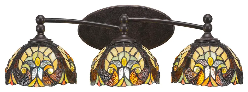 This exquisite wall sconce features a stunning inverted shade and is adorned with mauve; Beige; Pink; Orange; and Gray stained glass; while feathers feature Turquoise; Blue; and Purple. A scalloped crest of Purple; Blue; Orange; and Green edges the shade; which was created using the Meyda Tiffany copperfoil construction. This fixture is enhanced with a cast metal wall plate and floral shade fitter featured in a Mahogany Bronze finish. Install these fixtures to illuminate dining and foyers in residential; commercial; and hospitality settings to create a dramatic design statement from Memphis; Tennessee; to Wichita; Kansas; to Santa Barbara; California. The Tiffany Peacock Feather Wall Sconce is featured in our American-designed; handcrafted Tiffany Reproduction Collection. UL and cUL listed for dry and damp locations. Each shade is a unique work of art with color variations based on natural ingredients inherent in the glass.