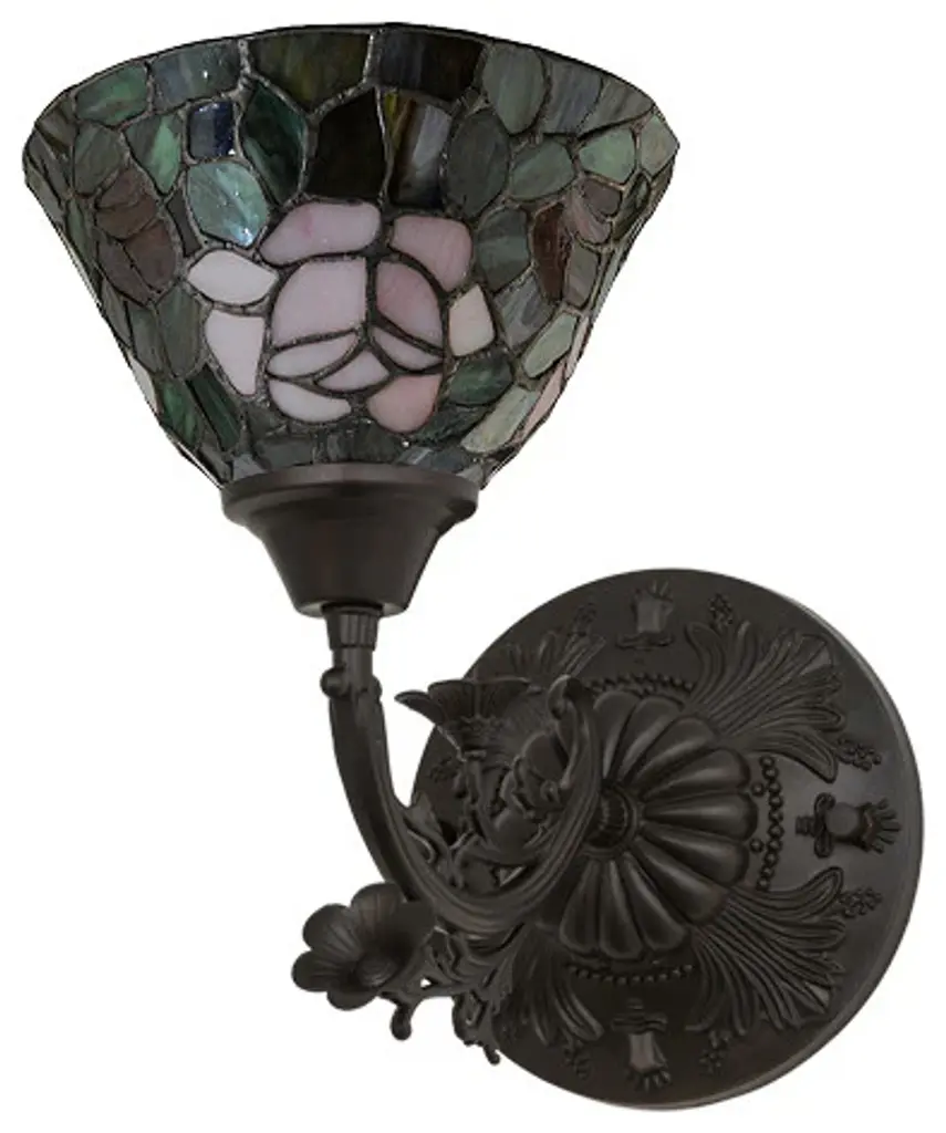 The most beloved of all flowers; the rose; is beautifully represented in this Meyda reproduction of a Tiffany Studio classic. Petal Pink; Romantic Red and Plum Passion art glass roses ramble on a maze of Garden Green leaves. The delicate domed stained glass shade is paired with a graceful; hand finished Mahogany Bronze one light wall sconce fixture.