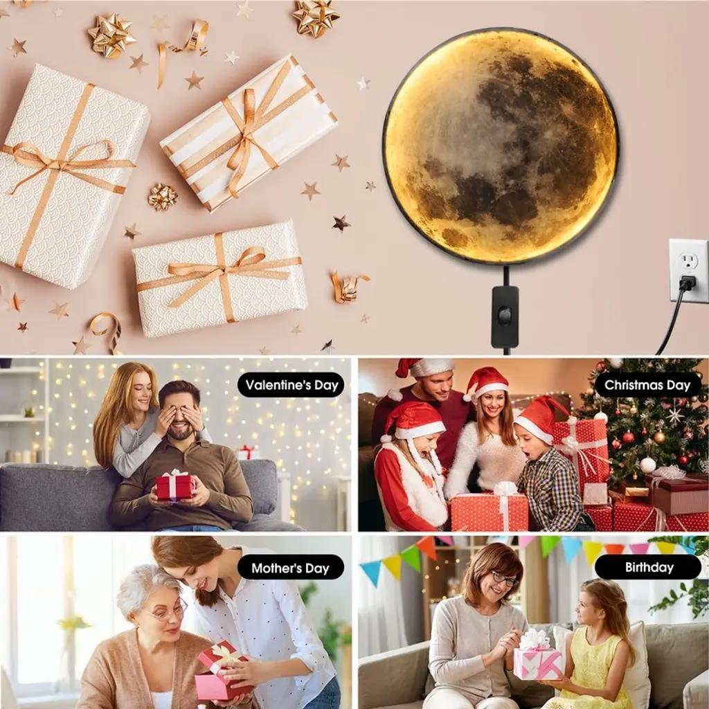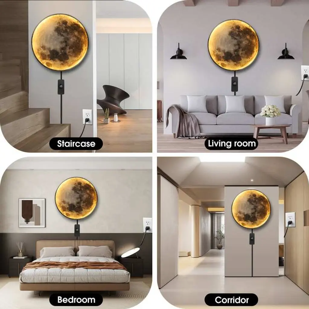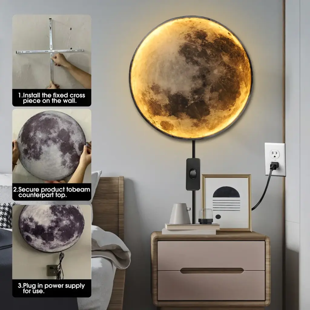Do you want to decorate your home more attractively? Please trust us, this newly designed modern LED moon wall sconce will become the highlight of your home. This is an amazing design that combines light and shadow with natural art. By day, it is a wall painting; by night, it is a wall light.·It's a plug-in modern LED wall light: Measuring 9.4 inches / 19.6 inches·Adjustable Wall Light: You can rapidly switch the light color—white light, natural light, or warm light—using the switch on the cord. Select your most cherished colors to create a superb lighting ambiance·Installation (Plug Type): Mount the cross fixing bracket on the wall. Install the wall sconce by aligning with the card position. It comes with a plug-in power cord that can be inserted into a wall socket for use·Multipurpose: This light can serve as a decorative light, atmosphere lamp, and wall lamp.·Suitable Places: It is highly suitable for various indoor spaces such as living rooms, bedrooms, hallways, stairways, children's rooms, dining rooms, hotels, shops, verandas, bars, cafes, KTVs, and other indoor decoration lighting occasions