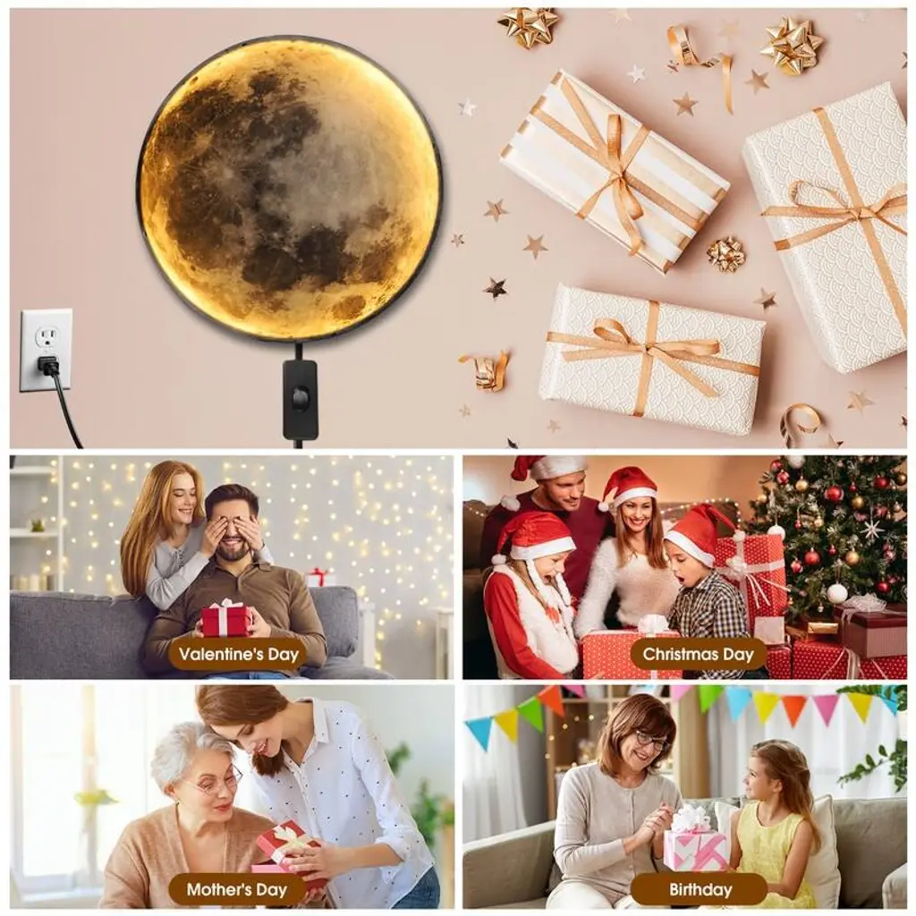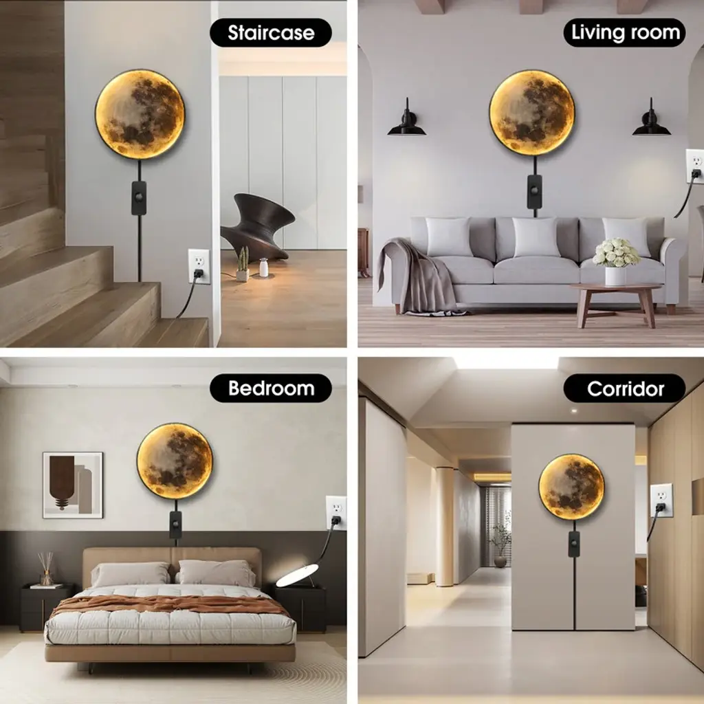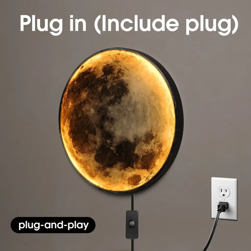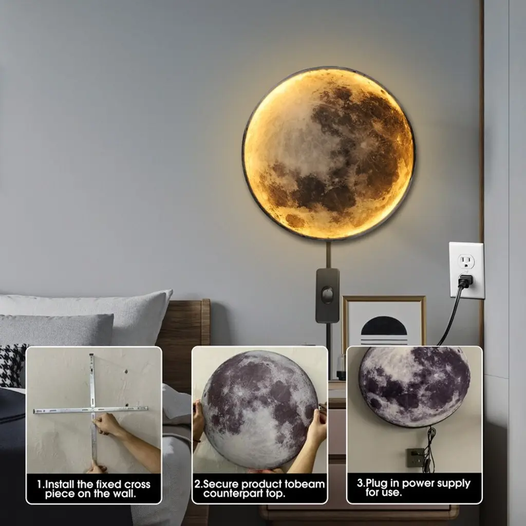Do you want to decorate your home more attractively? Please trust us, this newly designed modern LED moon wall sconce will become the highlight of your home. This is an amazing design that combines light and shadow with natural art. By day, it is a wall painting; by night, it is a wall light.·It's a plug-in modern LED wall light: Measuring 9.4 inches / 19.6 inches·Adjustable Wall Light: You can rapidly switch the light color—white light, natural light, or warm light—using the switch on the cord. Select your most cherished colors to create a superb lighting ambiance·Installation (Plug Type): Mount the cross fixing bracket on the wall. Install the wall sconce by aligning with the card position. It comes with a plug-in power cord that can be inserted into a wall socket for use·Multipurpose: This light can serve as a decorative light, atmosphere lamp, and wall lamp.·Suitable Places: It is highly suitable for various indoor spaces such as living rooms, bedrooms, hallways, stairways, children's rooms, dining rooms, hotels, shops, verandas, bars, cafes, KTVs, and other indoor decoration lighting occasions