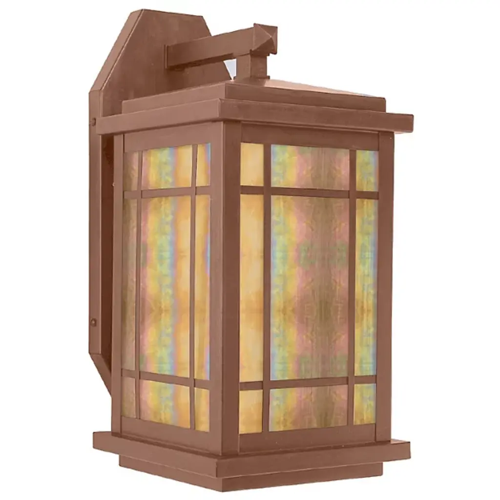 A clean look inspired by the Arts & Crafts movement. Custom crafted of Solid Copper, this abstract hilltop design is featured on Beige art glass and enhanced by hardware finished in a handsome Vintage Copper. Also available in Solid Brass. Ideal for indoor and exterior applications. Custom crafted by the hands of Meyda artisans in Yorkville, New York. Custom colors, styles and sizes available. Energy efficient lamping options. UL Approved: YesBulb Type: MEDBulb Quantity: 1Bulb Wattage: 60Bulbs Included: No