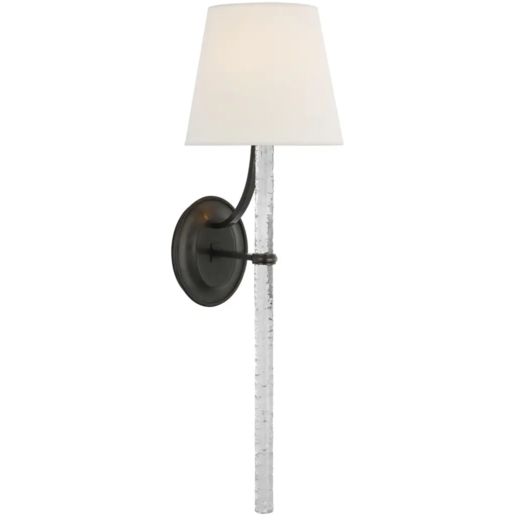 Retro style with an artistic modern spirit. The Abigail Wall Sconce from Visual Comfort Signature, formerly known as Visual Comfort, starts with a contoured disc wall plate, extending a central stem and curving metal brace above it out to a clear wavy glass rod that places a damp-listed candelabra lamp beneath a flared fabric shade. The fixture presents a traditional profile with a lighter character, as the shade moderates glare, while the translucent surface of the glass rod takes on a lambent glow of its own from the direct downlight that streams down across it.