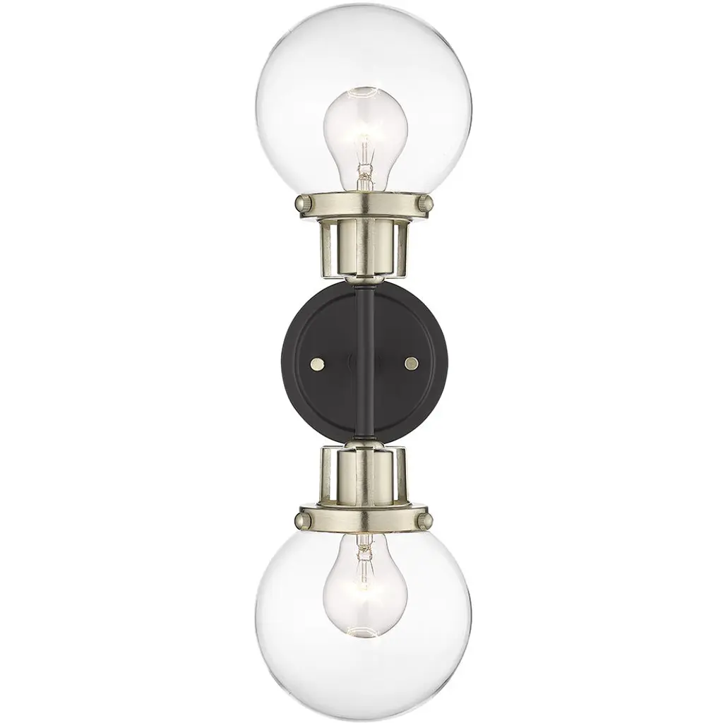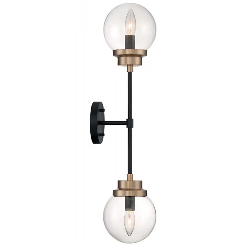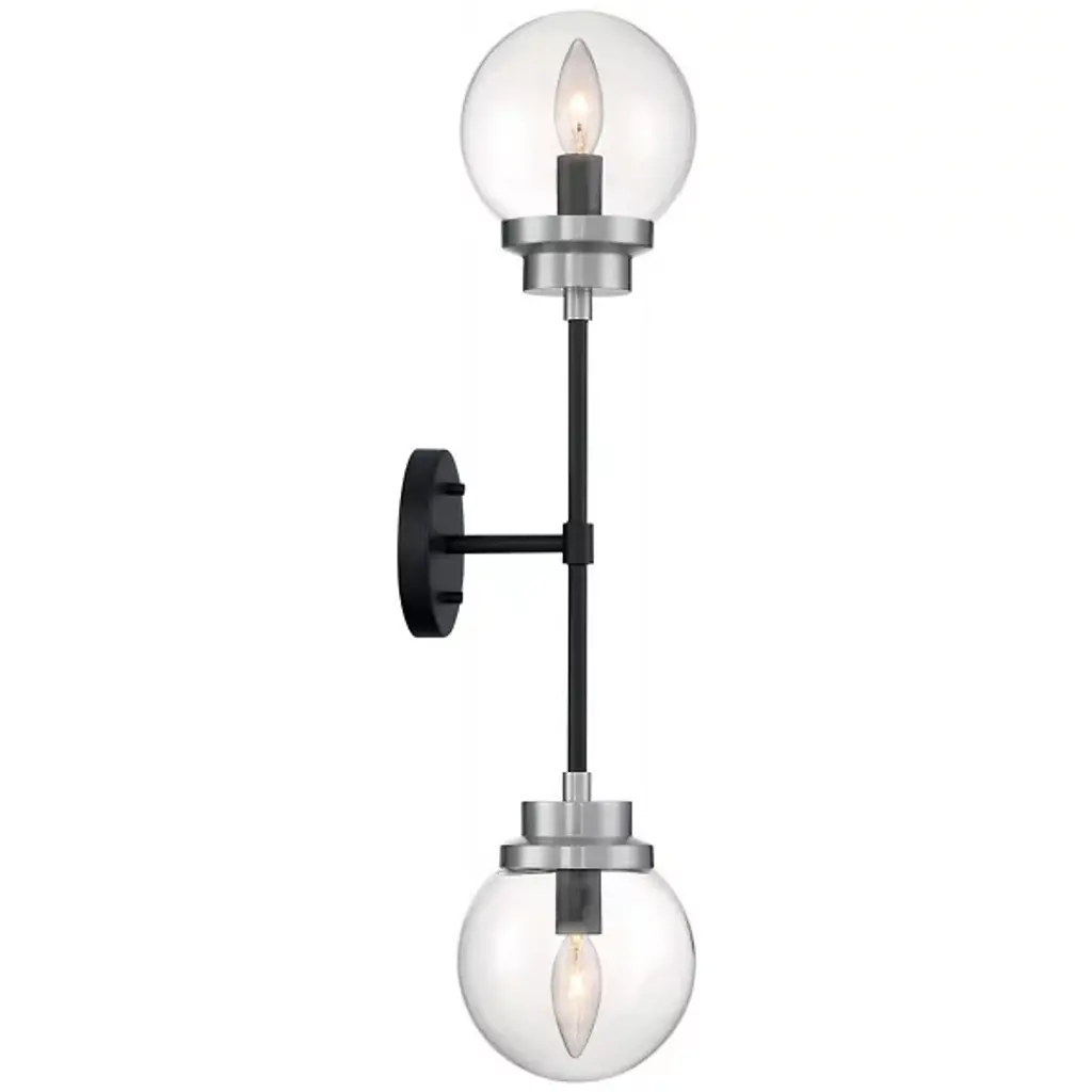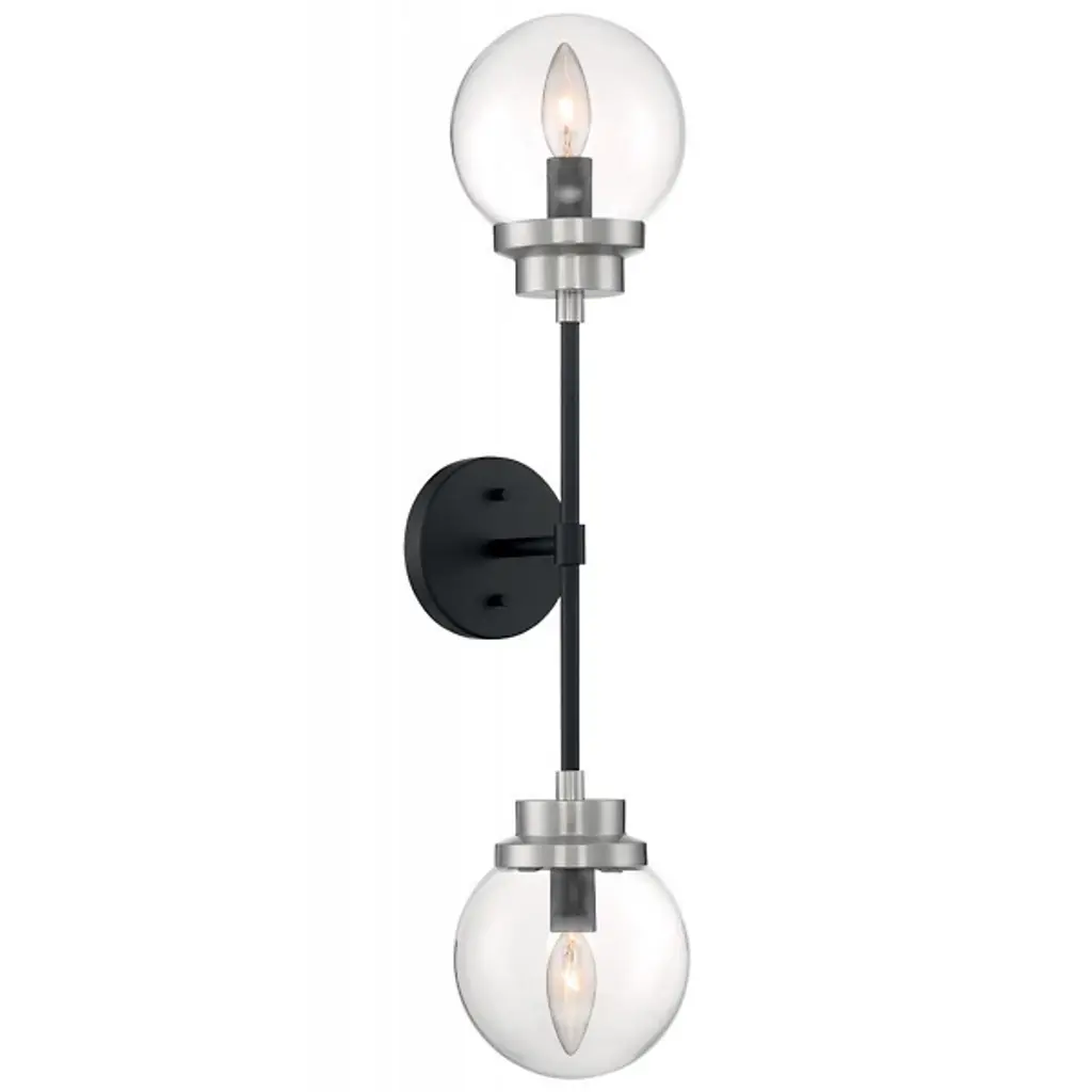 Bring an even layer of light to the walls of your modern home with the Abraham Wall Sconce from Satco. A round base mounts directly to the wall, extending a brief arm that connects with the thin, vertical body. At either end of this body is a clear glass sphere that houses a crisp bulb. The light from the bulbs diffuses through the glass with ease, creating a bright and full demonstration of light in the room.