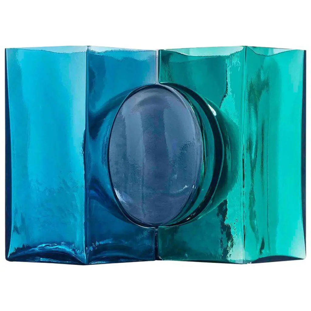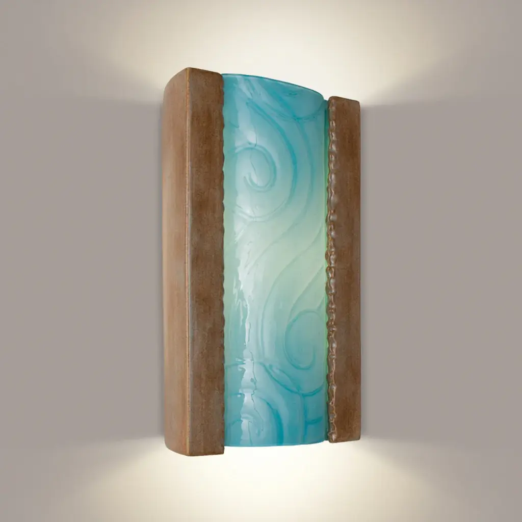 This one-of-a-kind wall light integrates Multi Turquoise fused art glass made from reclaimed window glass and kiln-fired, Butternut glazed ceramic. Light shines through openings at the top, the bottom and beautifully brings to life the unique enigmatic aesthetic of the hand-painted and kiln fired glass front. The fixture is rectangular from the front and back, trapezoidal from the top or bottom, with gently curving sides. Subtle color and texture variations are the hallmark of a truly handcrafted piece of art. Number of Bulbs: 1Bulb Type: CandelabraBulbs Included: NoWattage: 60Shade Included: YesHardwire or Plug: HardwireAdditional Features: Dimensions: 7.25"W x 13"H x 4"D, Lamping: (1) Outdoor Sheltered Socket for Wet Locations (Bulb not Included), Handmade from reclaimed window glass and ceramic in sunny California, USA., Naturally corrosion resistant. Indoor or outdoor (damp location)., ADA Compliant