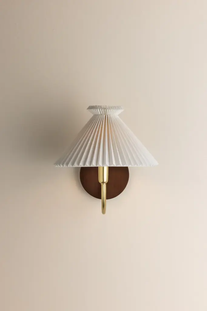 The Acacia sconce is playfully maximalist in form, yet tailored in materiality. The white linen shade has a sophisticated return on top, adding an unexpected twist to the pleated design. The shade is supported by a dramatic Aged Brass-finished J-arm, which connects to a wooden backplate through a simple sphere detail. The dark wood’s classic, heritage feel and contrasting color help visually separate the shade from the wall.