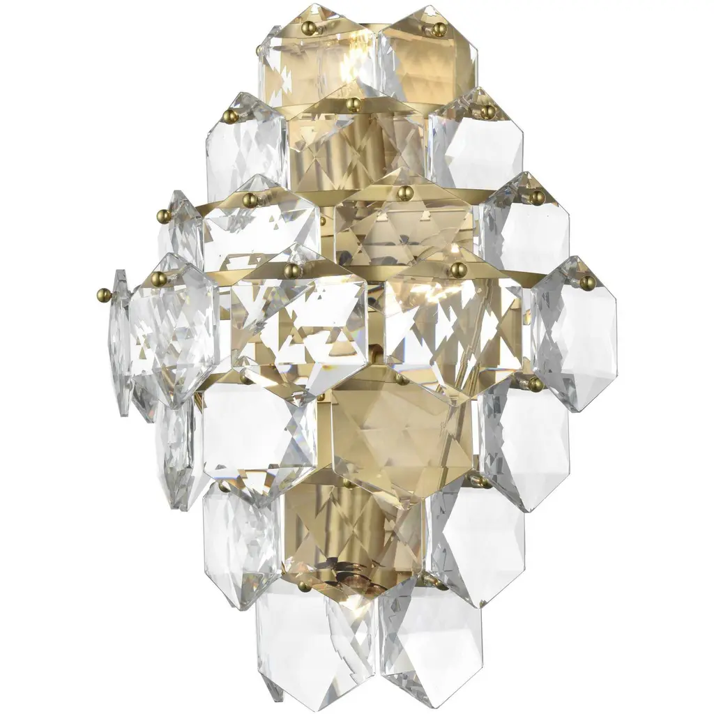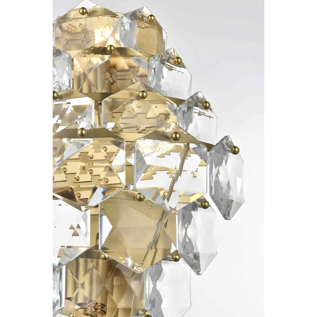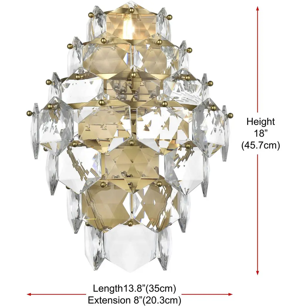 Add a touch of sophistication and shine to your space with this cascading crystal wall sconce light. Designed with a multi-tier arrangement of six-sided faceted crystals, this fixture creates a mesmerizing interplay of light and shadow, making it a standout addition to any room. Its sturdy iron frame is paired with your choice of a chrome finish for a sleek, modern aesthetic or satin gold for a warm, opulent feel. The fixture includes four E12 sockets (bulbs sold separately) and is fully dimmable, giving you the ability to set the perfect ambiance. The matching canopy finish completes the cohesive look. Compact yet visually impactful, this wall sconce is ideal for hallways, dining rooms, living rooms, bedrooms, or offices, offering both functional illumination and a dazzling decorative element.