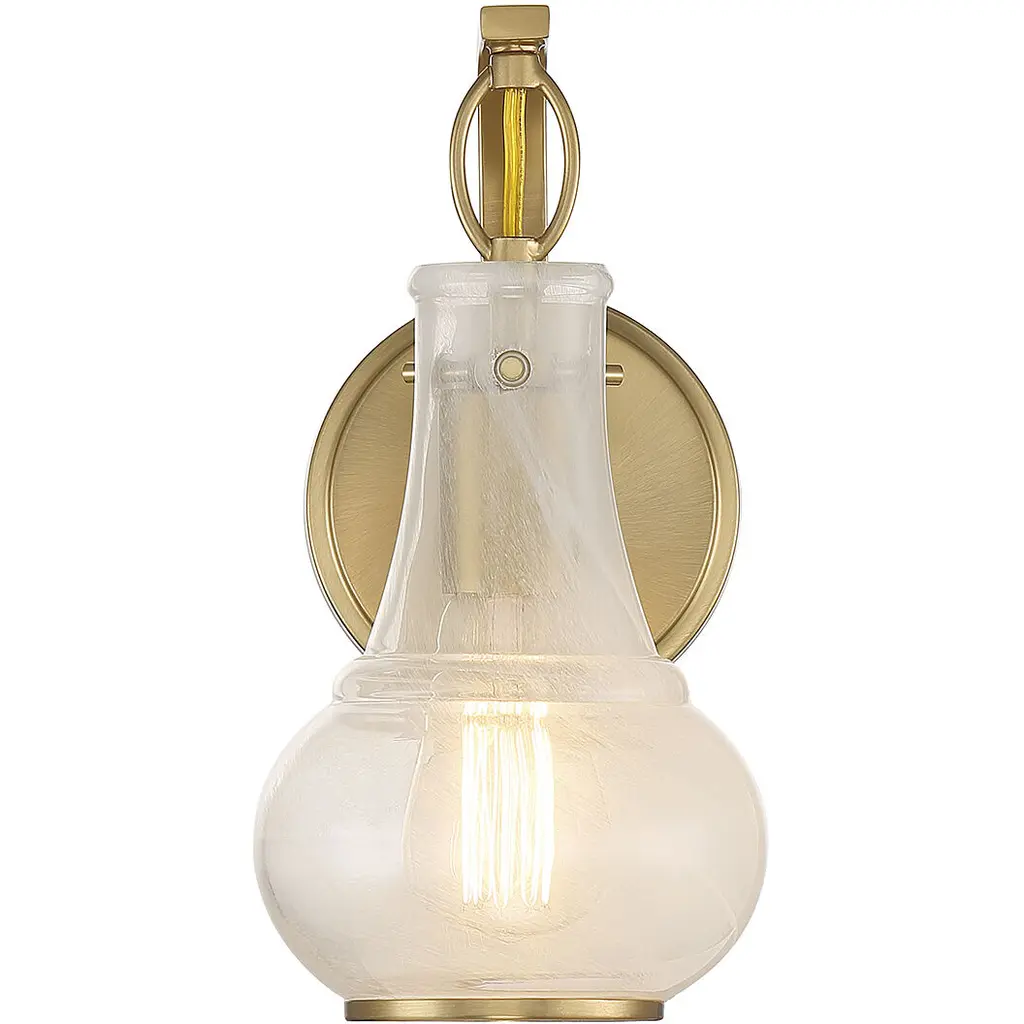 For the Adams 1-light sconce, Savoy House took traditional lighting style and gave it a fashionable twist for today's stylish homes A molded, curving shade of white strie glass offers an extra touch of eye-catching detail to go with the warm brass finish. Adams is 11" in height, 7" in width and extends 7.5" from the wall. Uses a standard size bulb with a max of 60 watts (bulb not included).