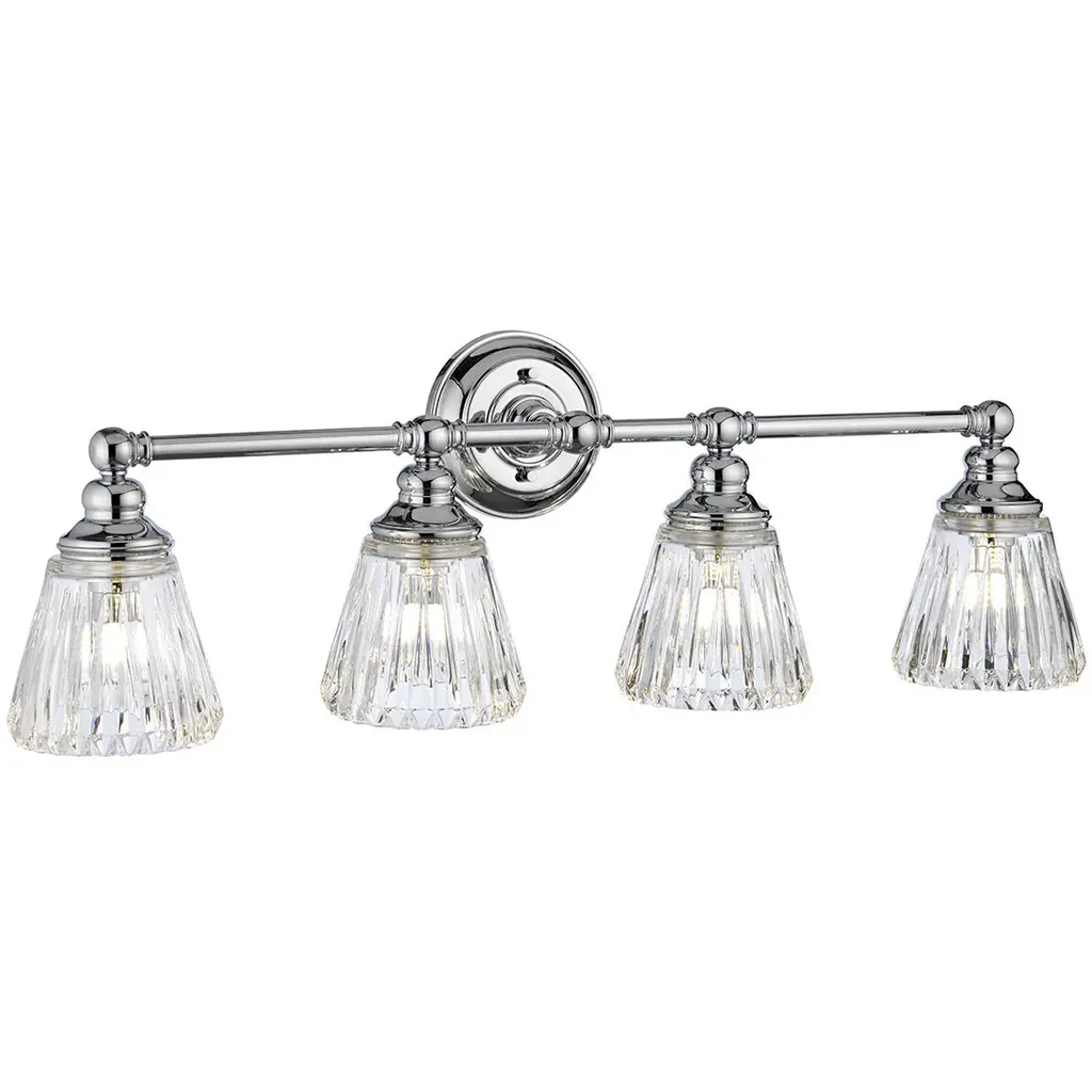 Classic styled 1 light bath light with clear cut glass and polished chrome finish. Can be hung up or downwards