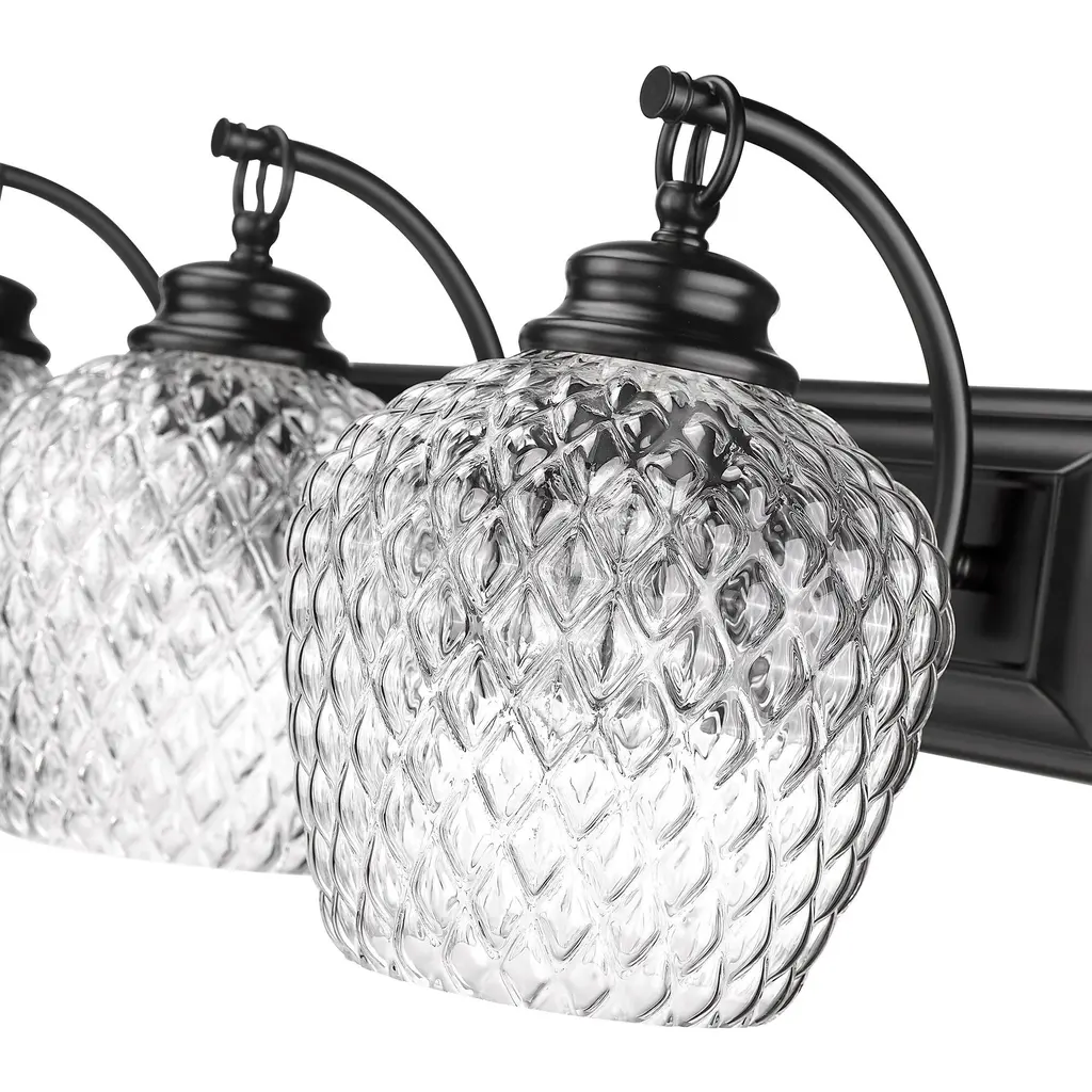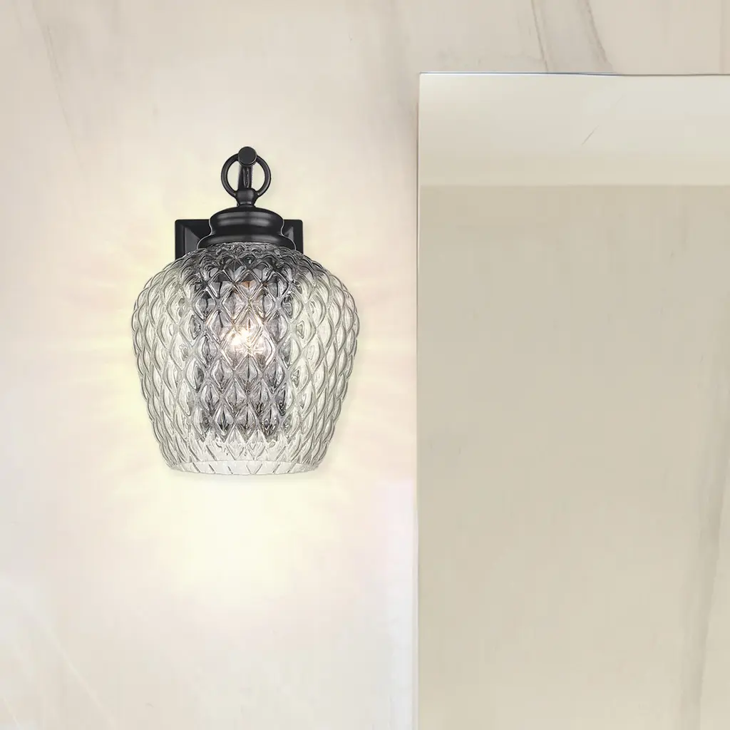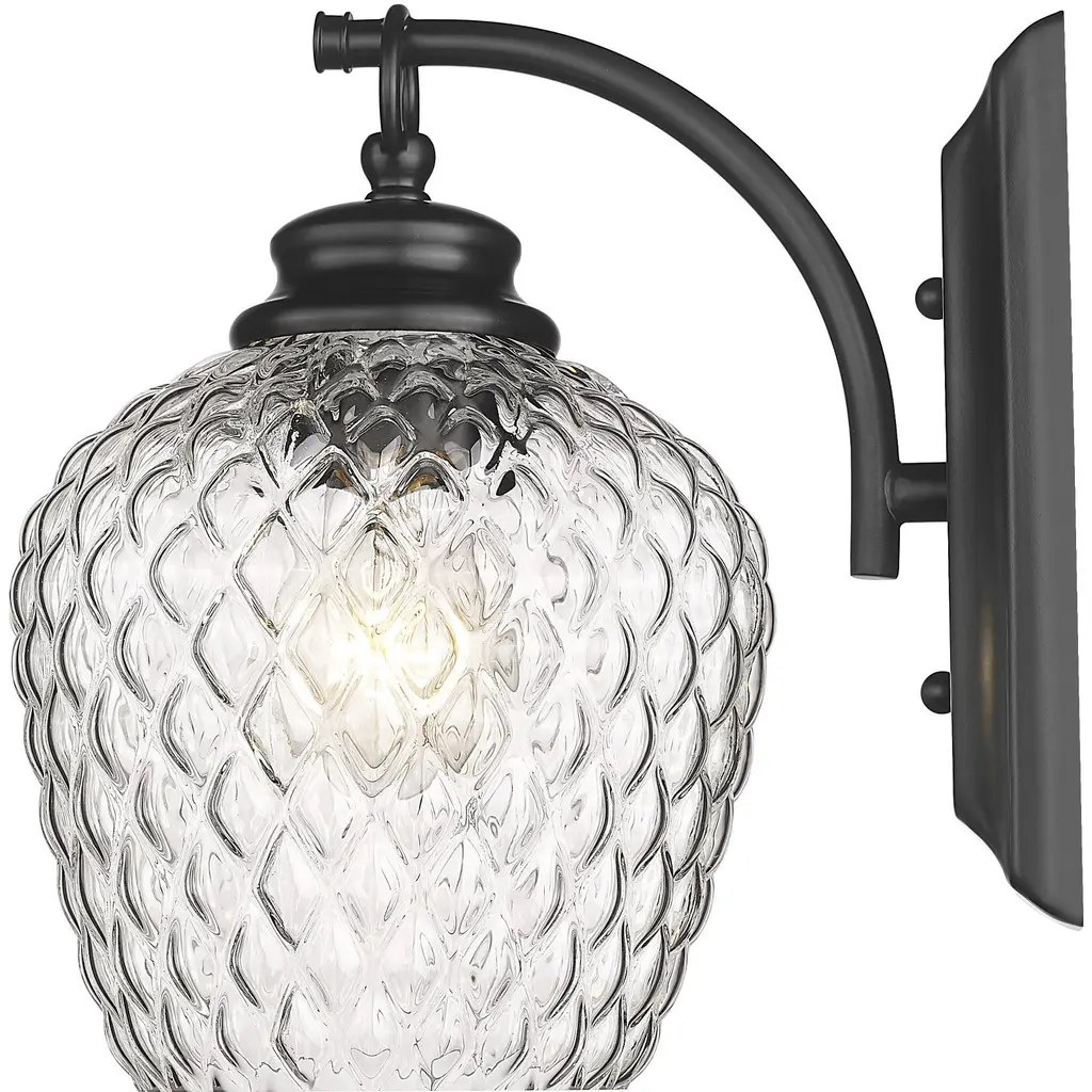 Bring farmhouse elegance into your home with the Golden Lighting Adeline 1-light Wall Sconce in Matte Black. Featuring a glass shade and a matte black frame, it creates a warm and inviting atmosphere.The clear glass shade offers brilliant, unobstructed light, showcasing the beauty of the bulb and fixture design. Its polished finish allows for a classic look that fits a variety of styles, from traditional to contemporary.This wall sconce's matte black finish is not only timeless but also versatile, ensuring it complements diverse decor choices.Enhance hallways, stairways, and bathroomsthis fixture is damp location rated. Requires 1 E26 medium base bulb (not included), with a maximum wattage of 100.With overall dimensions of 7.13"W x 10"H x 9.75"D, this stylish sconce adds character and quality to your living spaces, promoting a cozy ambiance.