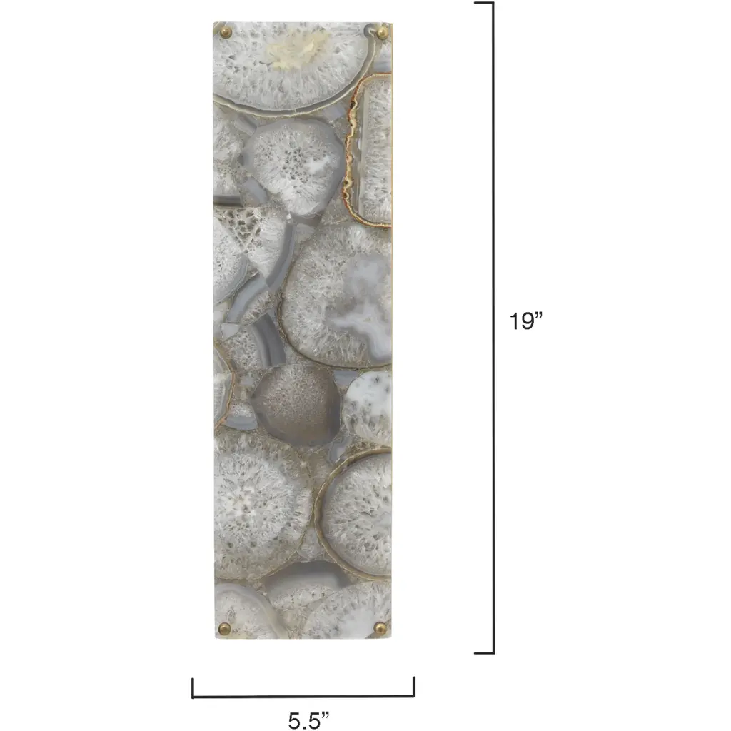 A collage of natural agate stone is joined together with clear resin and antique brass. This natural sculpture creates different colors and patterns within each piece, making it a truly one-of-a-kind piece in your home and on your wall.