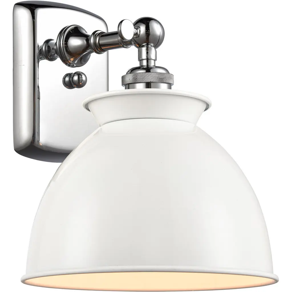 INNOVATIONS 616-1W-PC-M14-W Adirondack 1 Light Sconce part of the Edison Collection Polished Chrome. Style: Industrial, Farmhouse, Restoration-Vintage. Collection Name: Edison. Metal Finish(Body): Polished Chrome. Metal Finish(Shade): Glossy White. Metal Finish(Canopy/Backplate): Polished Chrome. Material: Steel, Cast Brass. Dimension(in): 10.75(H) x 8.25(W) x 8.625(Ext). Bulb: (1)60W Medium Base Incandescent(Not Included). Voltage: 120. Dimmable: Yes. Color Temperature (Kelvin): 2200. Color Rendering Index (CRI): 99.9. Lumens: 220. Life Expectancy (Hours): 2000. Shade Shape: Dome. Glass or Metal Shade Color: Glossy White. Shade Material: Metal. Metal Shade Description: White Adirondack. Shade Dimension(in): 8.25(W) x 5.5(H). Fitter Measurement (Glass Or Metal Shade Fitter Size): Neckless with a 1.625 inch opening. Backplate Dimension(in): 6(H) x 4.5(W) x 0.75(Depth). ADA Compliant: No. California Proposition 65 Warning Required: Yes. UL/ETL Certification Type: Damp Location.