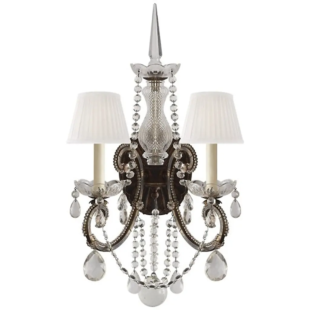 The Adrianna Double Wall Sconce by Visual Comfort Signature, formerly known as Visual Comfort, exudes opulence and stunning traditional style. From designer Ralph Lauren, this fixture features elaborate scrollwork that accentuates its sweeping framework made of gilded iron. Two arms hold crystal bobeches and candlesticks with incandescent bulbs casting soft light throughout. Draped clear crystal beads sparkle as they catch the light, while tapered silk shades enhance its classical aesthetic as they filter its warm glow.