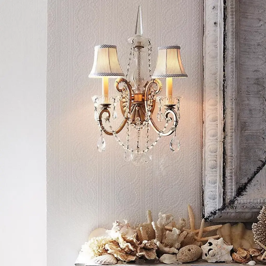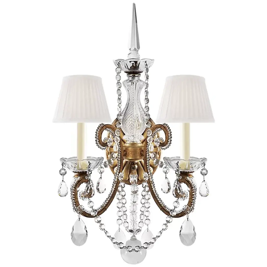 The Adrianna Double Wall Sconce by Visual Comfort Signature, formerly known as Visual Comfort, exudes opulence and stunning traditional style. From designer Ralph Lauren, this fixture features elaborate scrollwork that accentuates its sweeping framework made of gilded iron. Two arms hold crystal bobeches and candlesticks with incandescent bulbs casting soft light throughout. Draped clear crystal beads sparkle as they catch the light, while tapered silk shades enhance its classical aesthetic as they filter its warm glow.