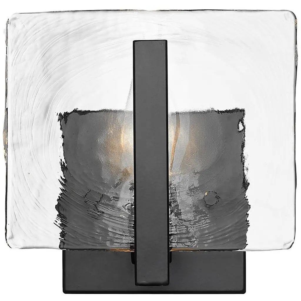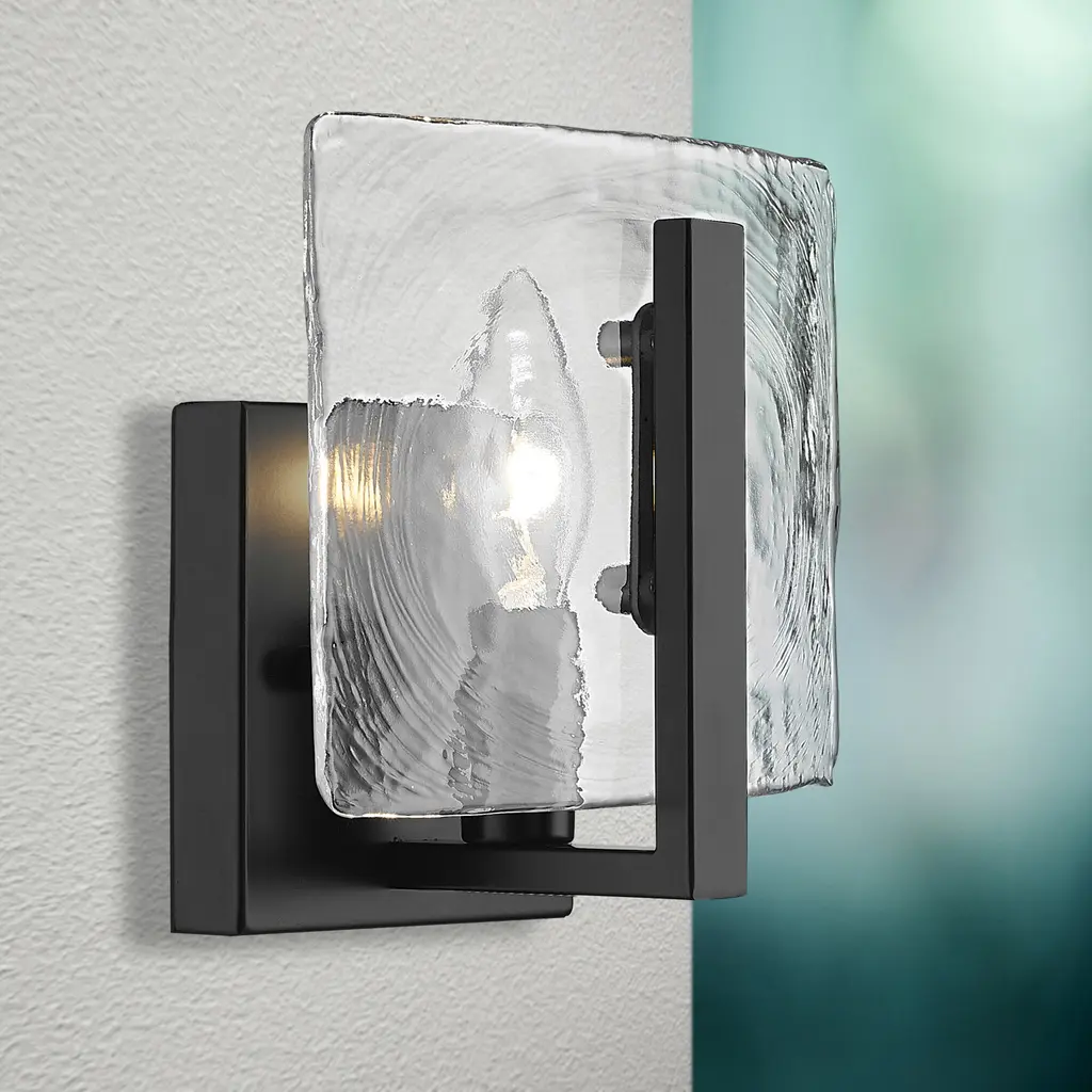 Transform your space with the Golden Lighting Aenon 1-light Wall Sconce. Featuring a glass shade, this piece beautifully introduces nature-inspired elegance into your home. The Hammered Water Glass shade showcases a striking, irregular texture that mimics the beauty of flowing water, creating a mesmerizing light effect. The Matte Black finish offers a timeless charm that suits various decor styles, from minimalist to contemporary. It resonates with sophistication and smoothness, making it an ideal foundation for any design approach.Perfect for hallways, stairways, and bathrooms, this fixture is damp location rated, ensuring safety in covered spaces with occasional moisture. Requires 1 E12 candelabra base bulbs (not included) with a maximum wattage of 60. Dimensions measure 6.88"W x 6.75"H x 4"D.Experience unmatched quality and artistry in your lighting choices with this delightful sconce.