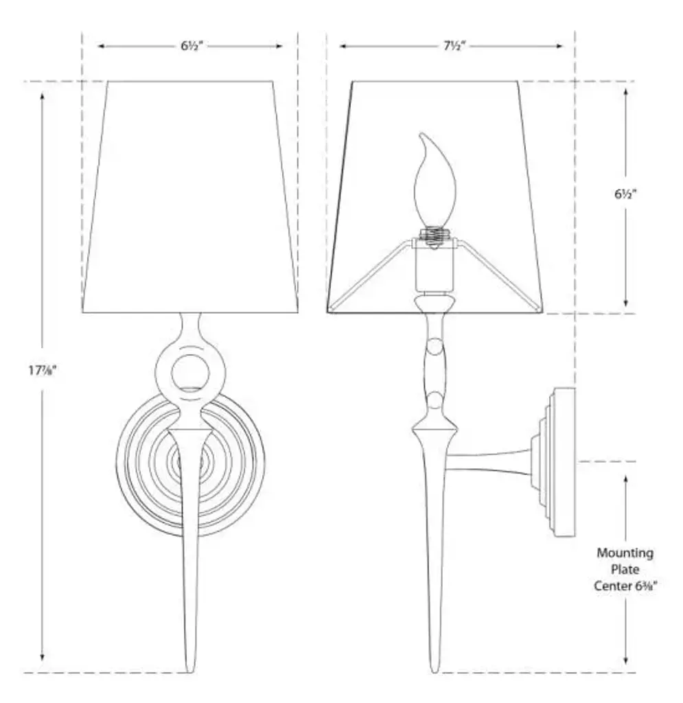 Bristol Single Sconce in Aged Iron with Linen Shade Designer: AERIN Height: 18" Extension: 7.5" Backplate: 4.5" Round Mounting: Hardwire Shade Detail: 5" x 7" x 6.5" Linen Nordy Socket: E12 Candelabra Wattage: 40 B11 Safety Rating Location: DRY