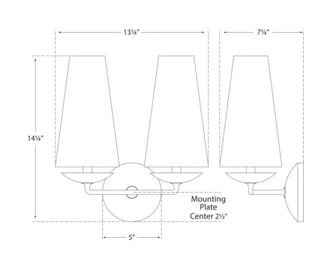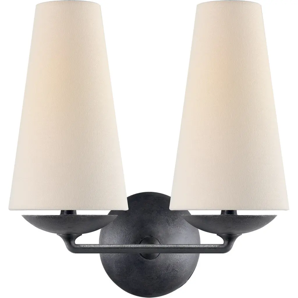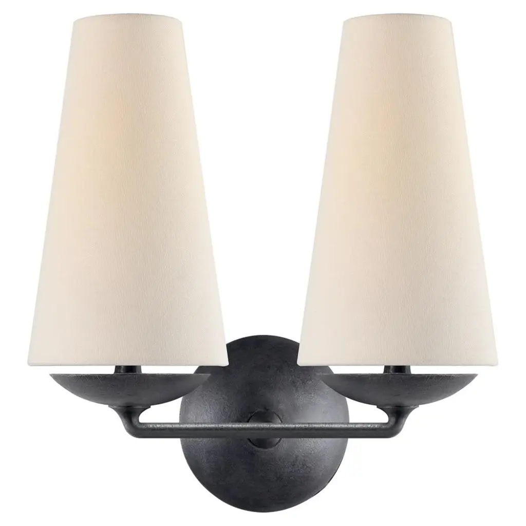 Fontaine Double Sconce in Aged Iron with Linen Shades Designer: AERIN Height: 14.25" Extension: 7.25" Backplate: 5" Round Mounting: Hardwire Shade Detail: 3" x 5.5" x 9.5" Linen Socket: 2 - E12 Candelabra Wattage: 2 - 40 B11 Safety Rating Location: DRY