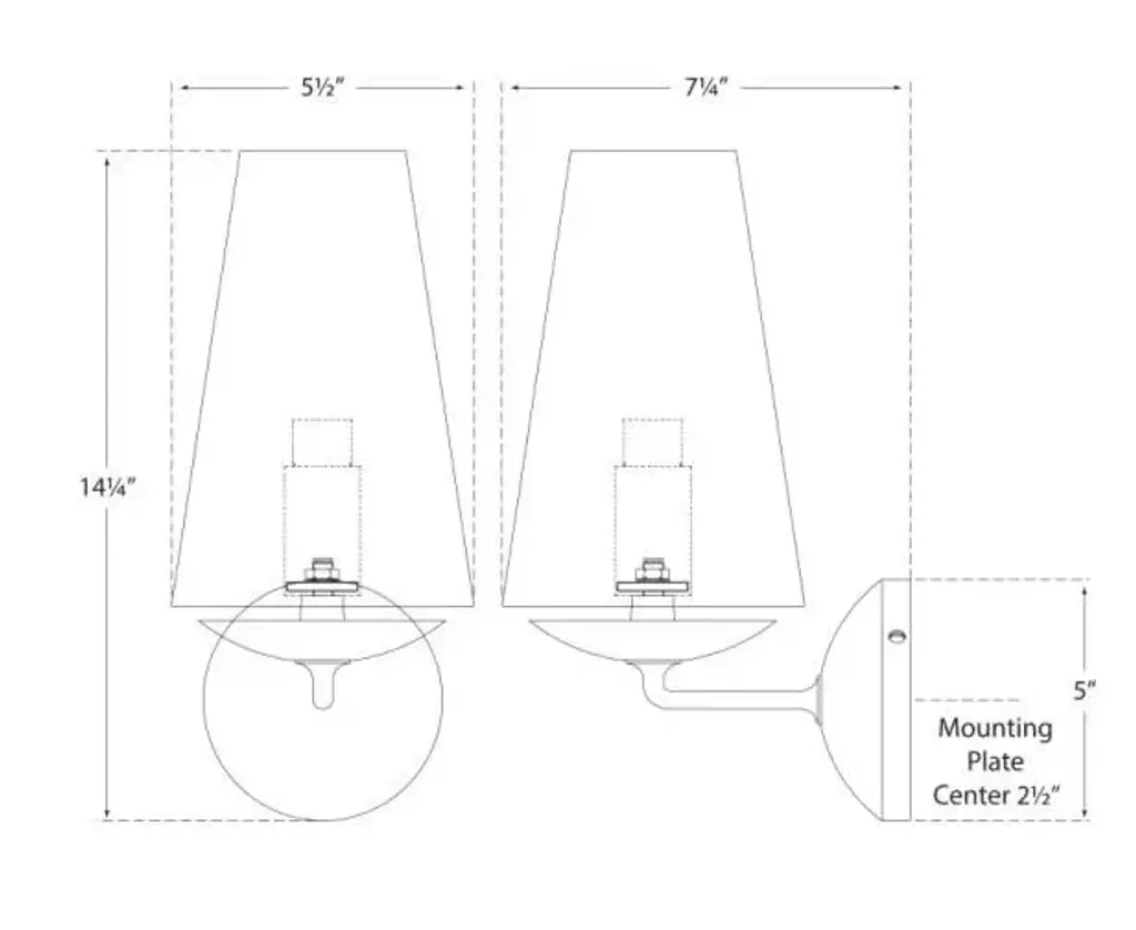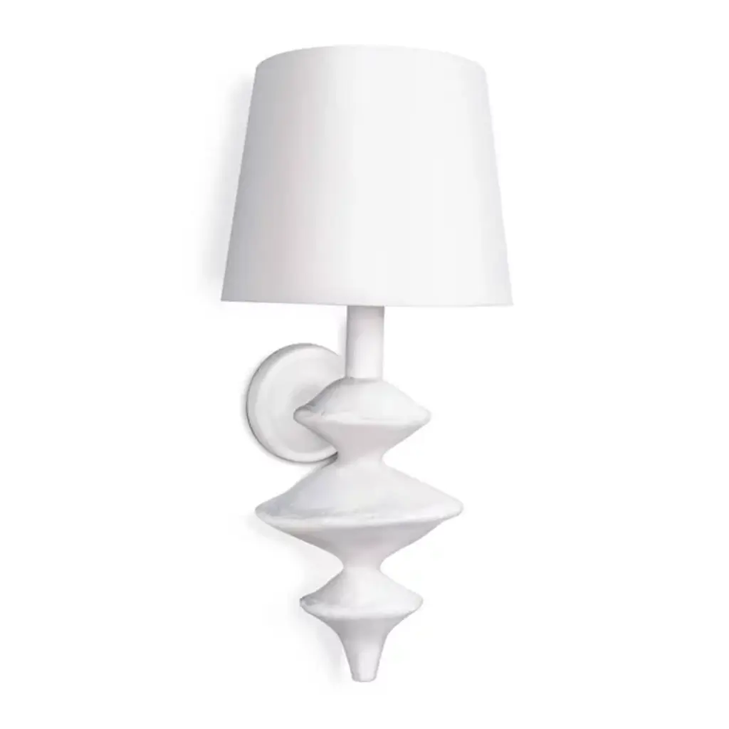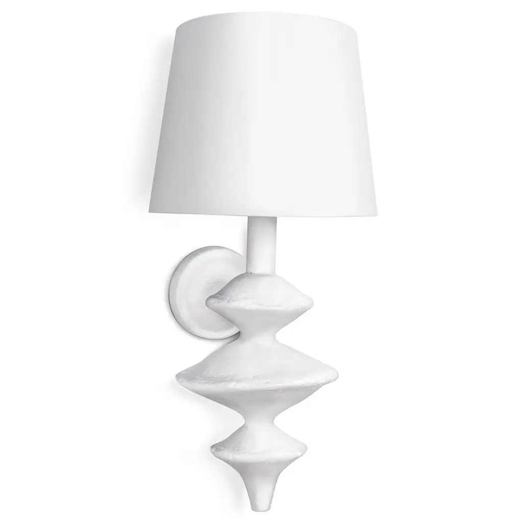 Fontaine Single Sconce in Plaster with Linen Shade Designer: AERIN Height: 14.25" Extension: 7.25" Backplate: 5" Round Mounting: Hardwire Shade Detail: 3" x 5.5" x 9.5" Linen Socket: E12 Candelabra Wattage: 40 B11 Safety Rating Location: DRY
