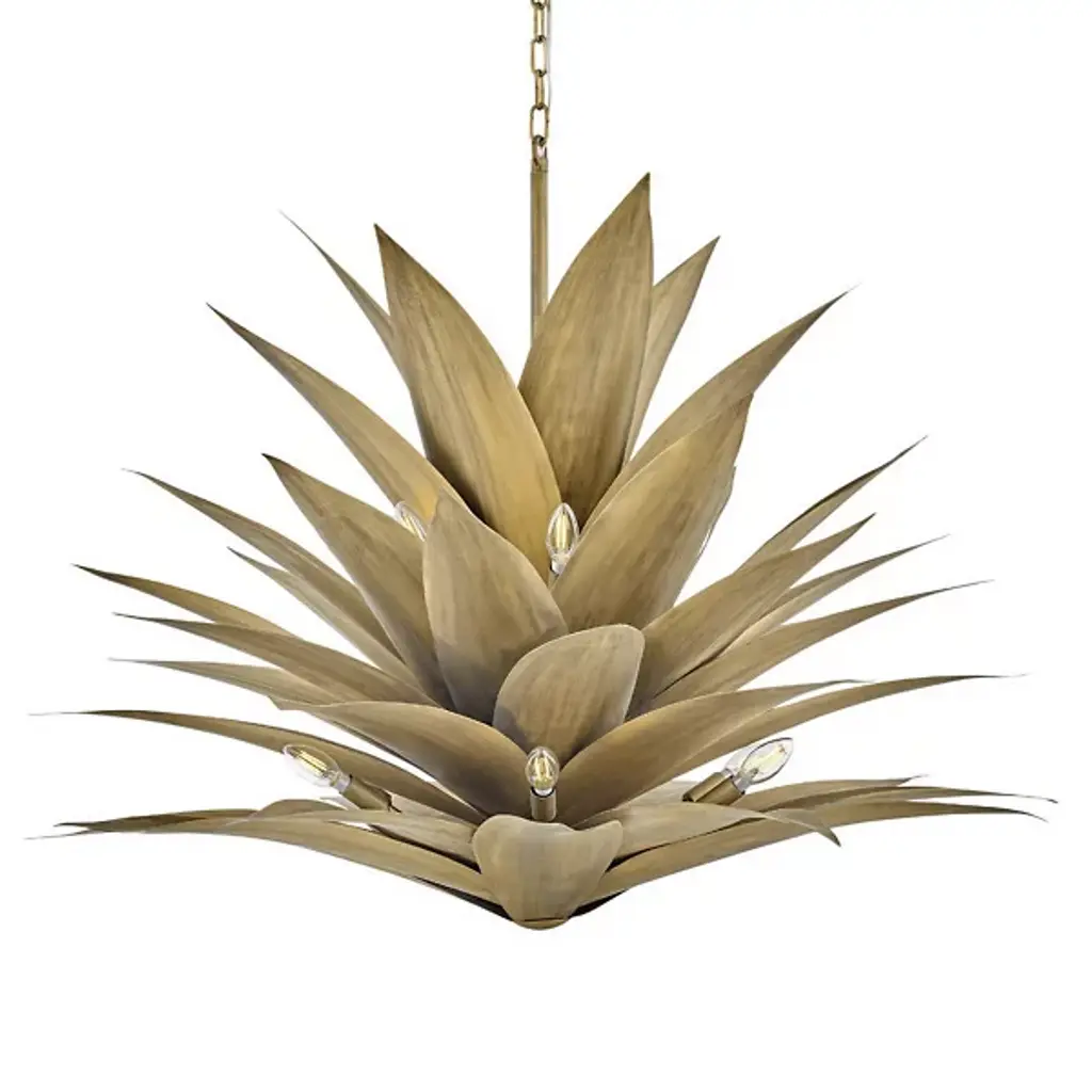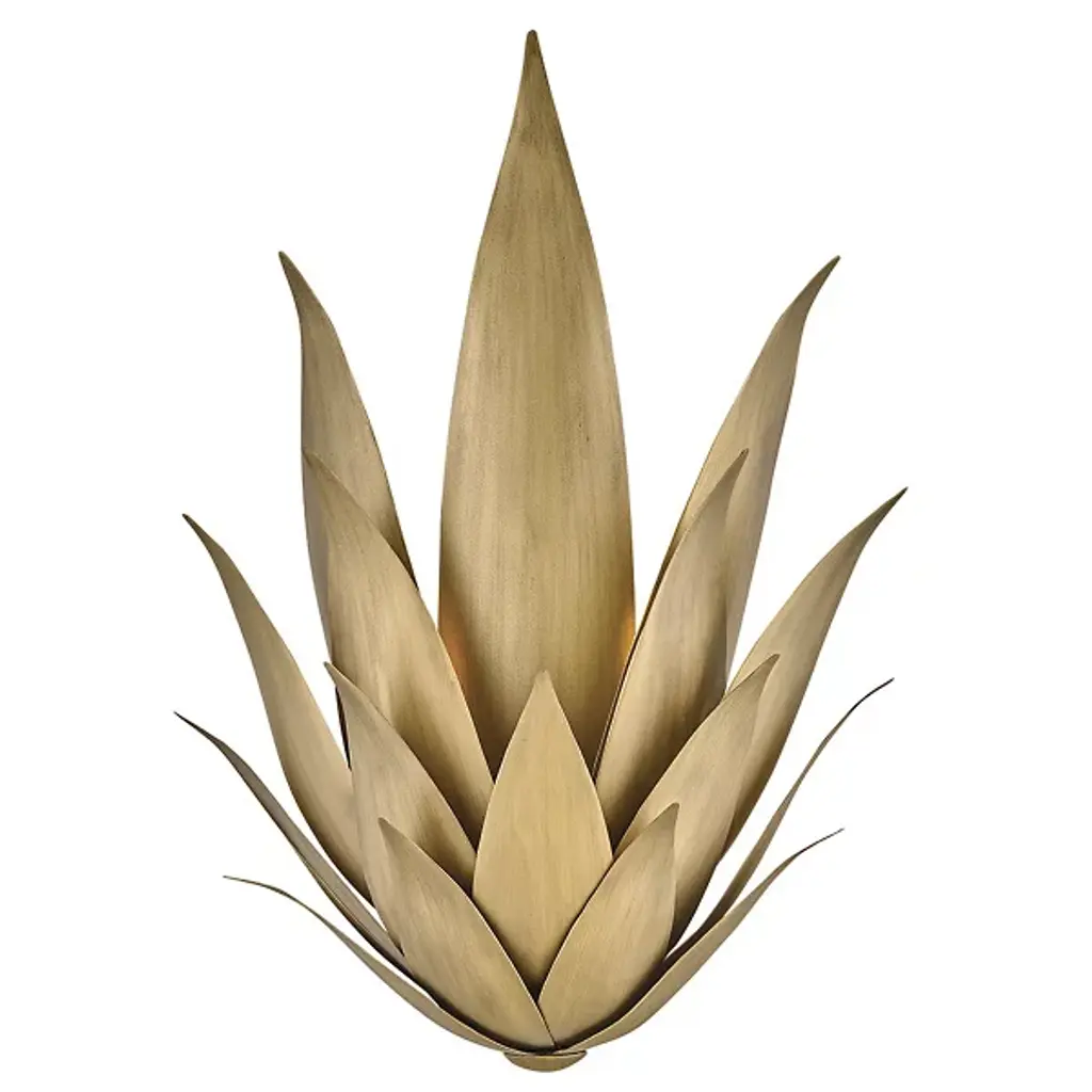 The Agave Wall Sconce from Currey & Company combines form and function with its distinctive hand-sculpted, layered design inspired by the agave plant. Its fountain-like silhouette creates a striking visual effect, showcasing an organic yet structured aesthetic. The bold shape and intricate details make it a standout piece in modern interiors. Designed for a clean look, the mounting hardware is concealed on the backplate. This fixture offers a unique, nature-inspired statement while providing both decorative appeal and functional illumination.