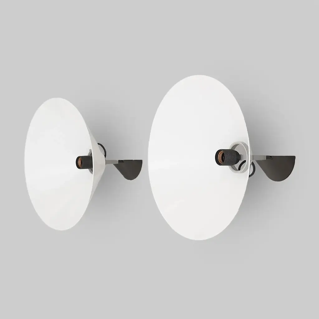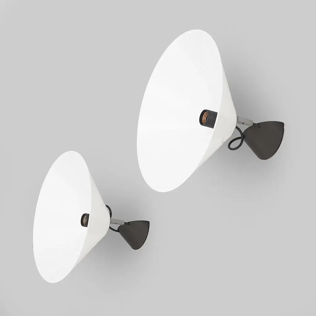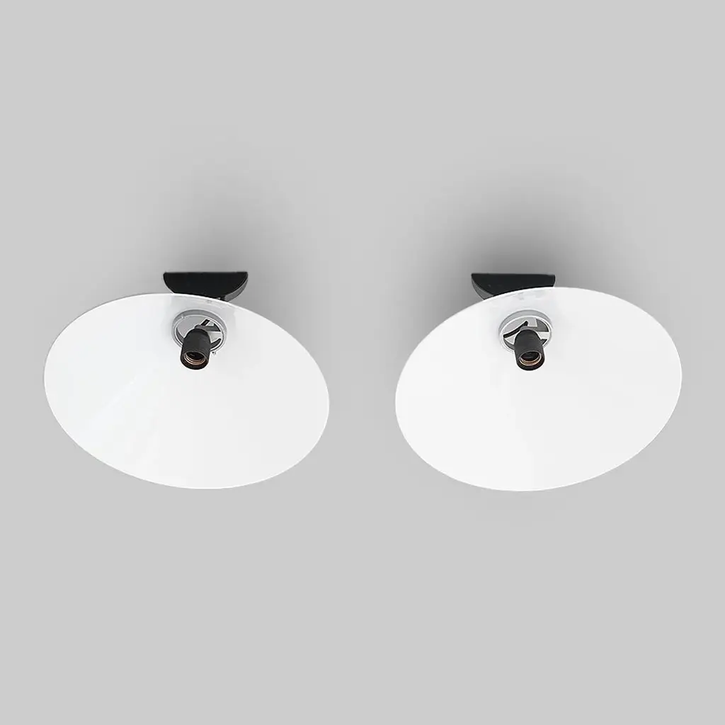 Pair of wall lamps of Italian manufacture produced by Artemide in the 70s designed by Enzo Mari. Wall support in black painted metal and plastic. Stem in burnished metal. Lamp body in aluminum. Diffuser in white plastic. Good general condition, small signs of use. Dimensions: Diameter 38 cm - Depth 26 cm I have official proof of authenticity such as vintage catalogs, designer records, or other literature sources and take full responsibility for any authenticity issues arising from misattribution, European Plug (up to 250V).The wiring of this item may be original and might need replacement, if not specified otherwise.