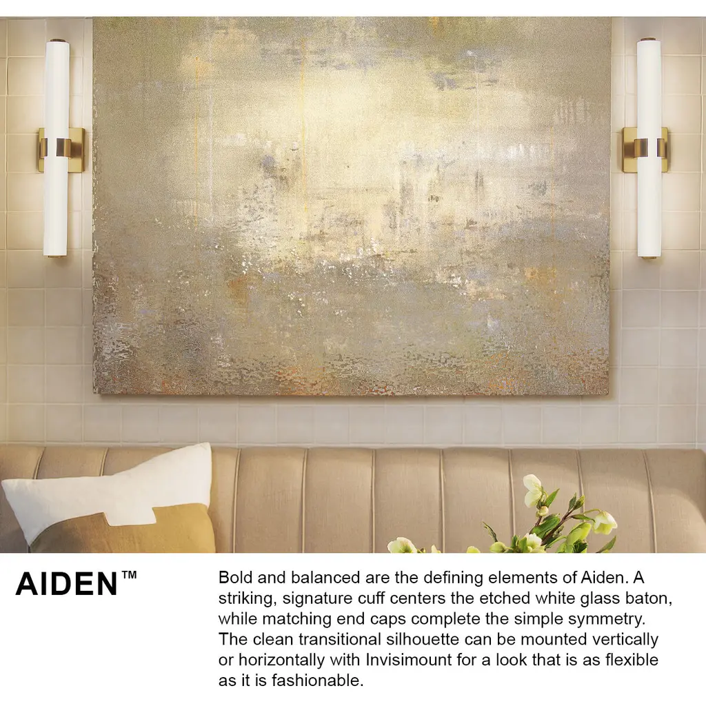 Bold and balanced are the defining elements of Aiden. A striking, signature cuff centers the etched white glass baton, while matching end caps complete the simple symmetry. The clean transitional silhouette with either a Chrome or Black finish can be mounted vertically or horizontally with Invisimount for a look that is as flexible as it is fashionable.