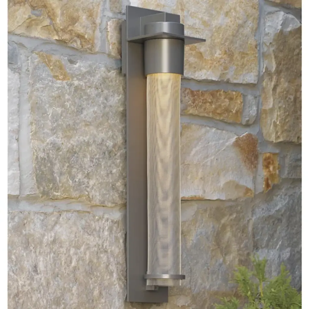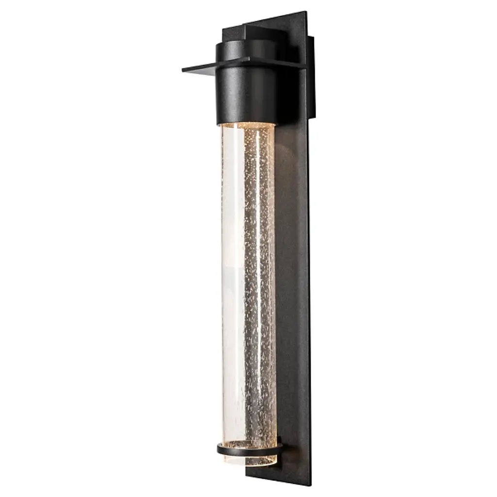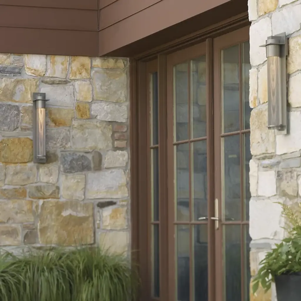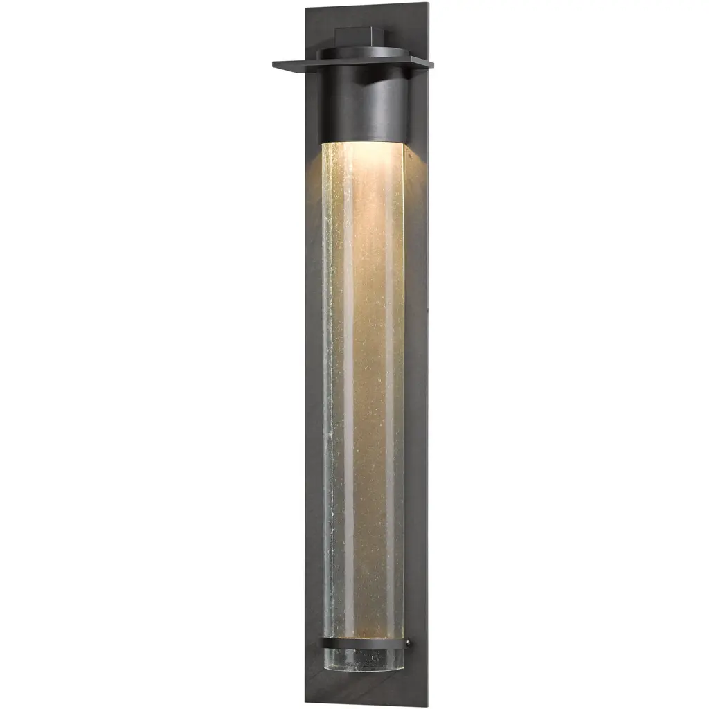 Dynamic dance of light and texture. The Airis Coastal Outdoor Wall Sconce by Hubbardton Forge offers dramatic lighting to spruce up your backyard, patio, and entryway. Backed by a rectangular wall plate, it holds a sleek cylindrical glass shade below the concealed light source to cast a bright downlighting that creates interesting shadows around the luminaire. The frame is hand-forged from robust aluminum and treated with a coastal finish to endure humid and salty air without rusting.