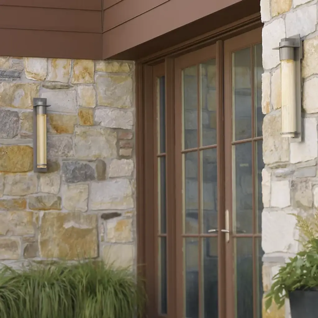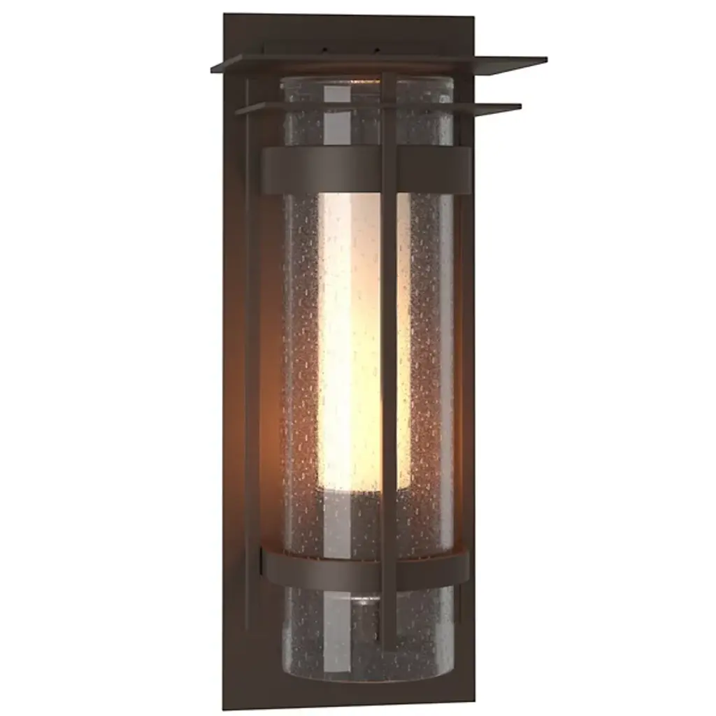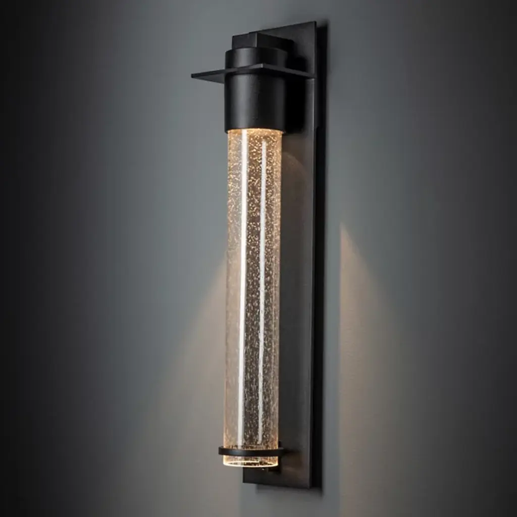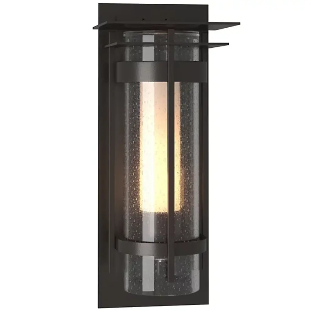 Dynamic dance of light and texture. The Airis Coastal Outdoor Wall Sconce by Hubbardton Forge offers dramatic lighting to spruce up your backyard, patio, and entryway. Backed by a rectangular wall plate, it holds a sleek cylindrical glass shade below the concealed light source to cast a bright downlighting that creates interesting shadows around the luminaire. The frame is hand-forged from robust aluminum and treated with a coastal finish to endure humid and salty air without rusting.