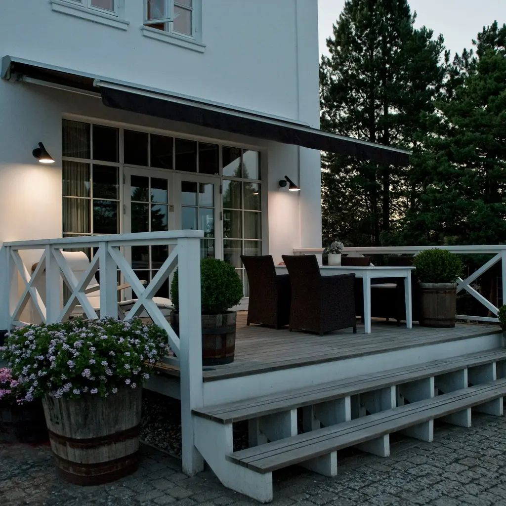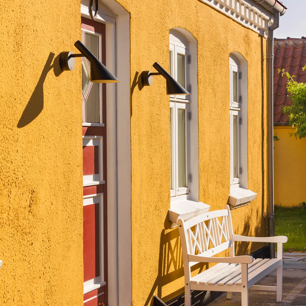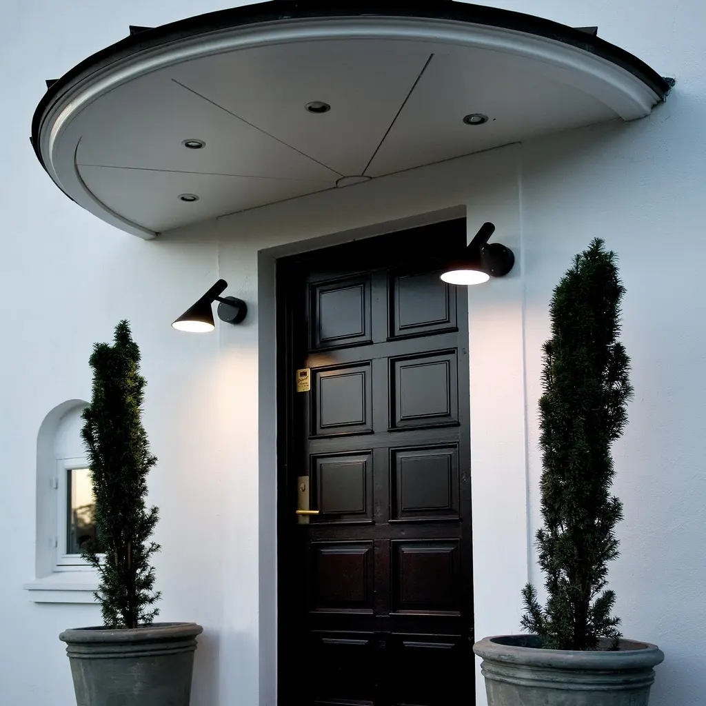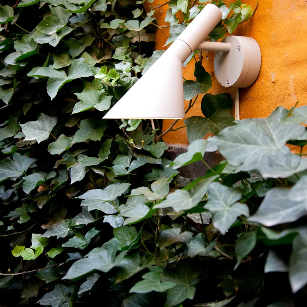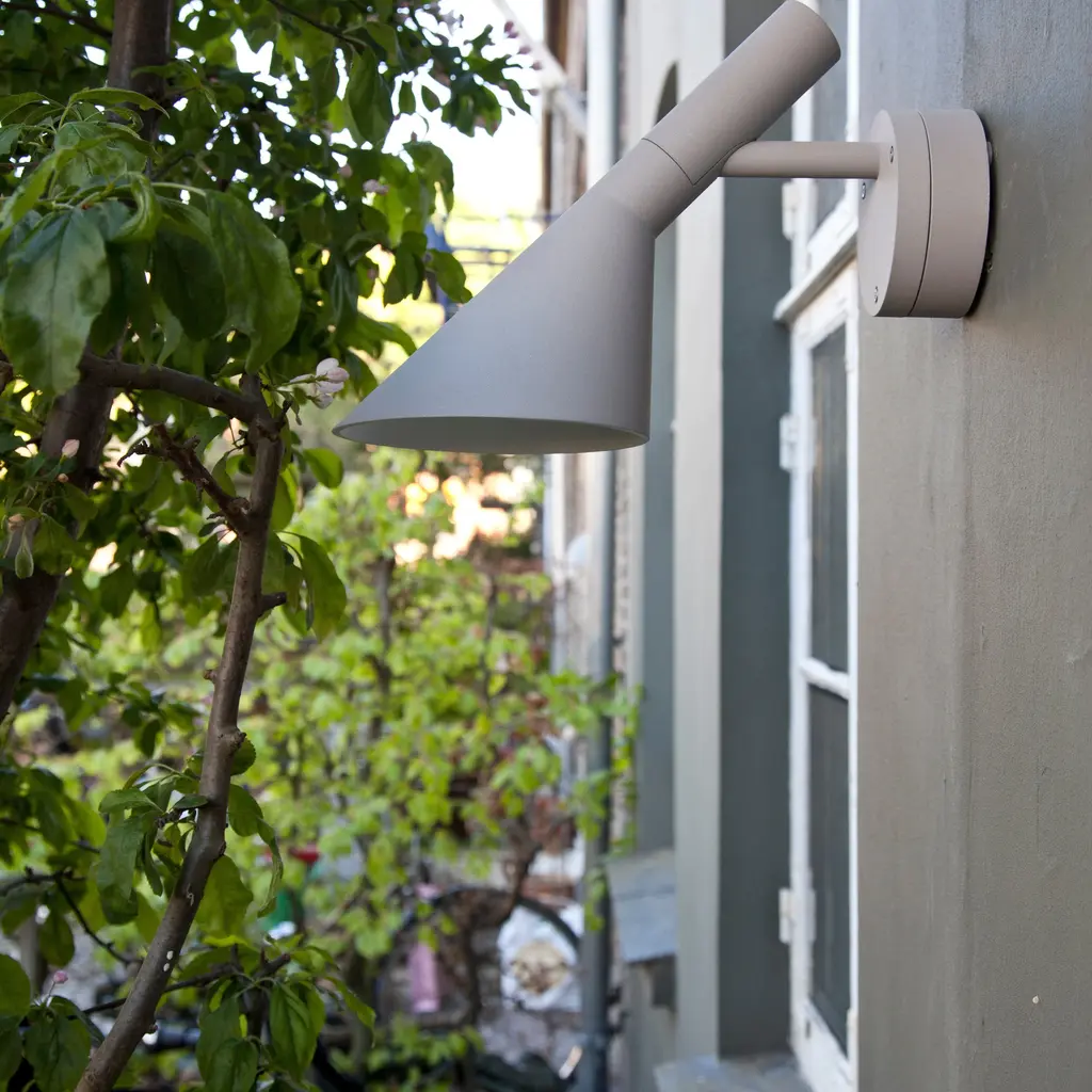 The AJ 50 Outdoor Wall Lamp is a modernized version of his iconic AJ lamp from 1960, originally created for Copenhagen's SAS Royal Hotel. The lamp emits downward-directed, glare-free light, thanks to its conical shade and white-painted interior. With an IP65 rating, it's well-suited for outdoor environments, providing stylish and functional illumination for patios, entrances, or garden spaces.