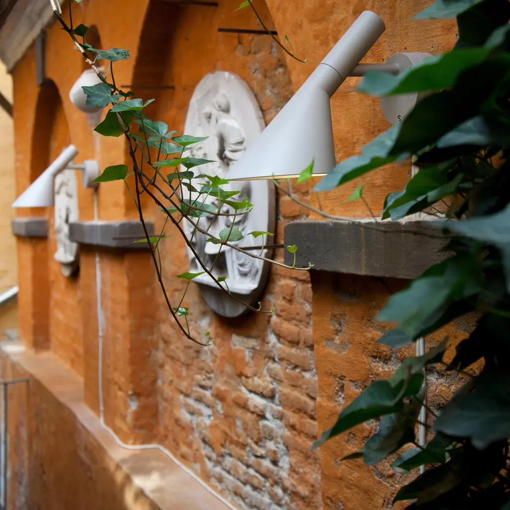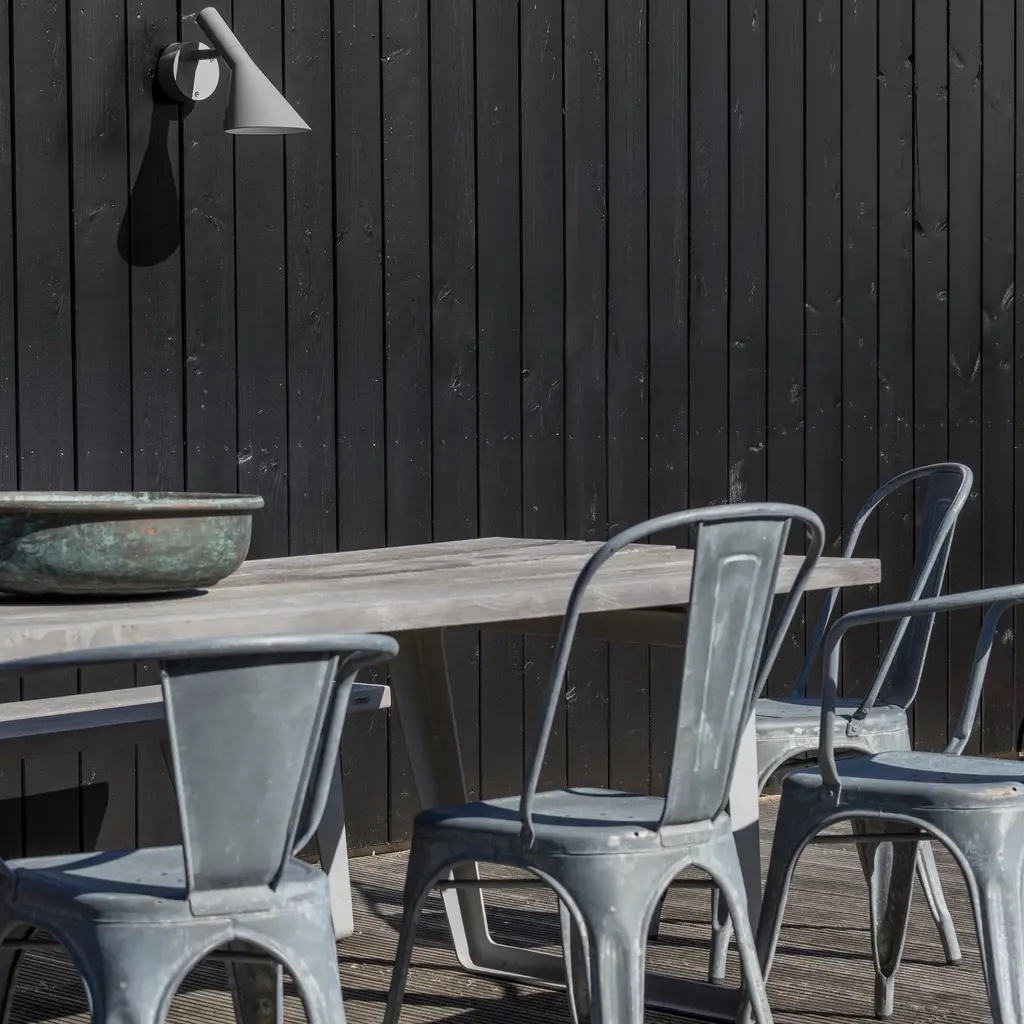 The AJ 50 Outdoor Wall Lamp is a modernized version of his iconic AJ lamp from 1960, originally created for Copenhagen's SAS Royal Hotel. The lamp emits downward-directed, glare-free light, thanks to its conical shade and white-painted interior. With an IP65 rating, it's well-suited for outdoor environments, providing stylish and functional illumination for patios, entrances, or garden spaces.